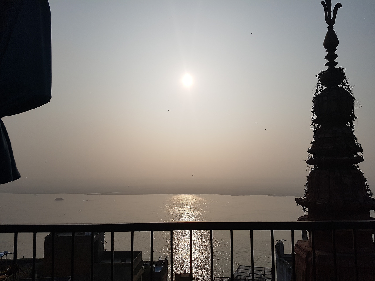 (좌) 보트 위에서 자연스레 생각에 잠겼다, (우) 숙소 옥상에서 갠지스강 위로 떠오르는 태양을 보며 아침을 먹었다.