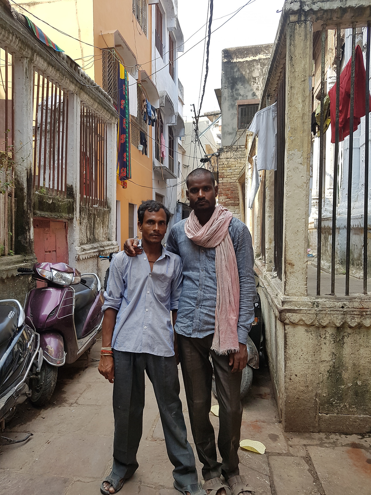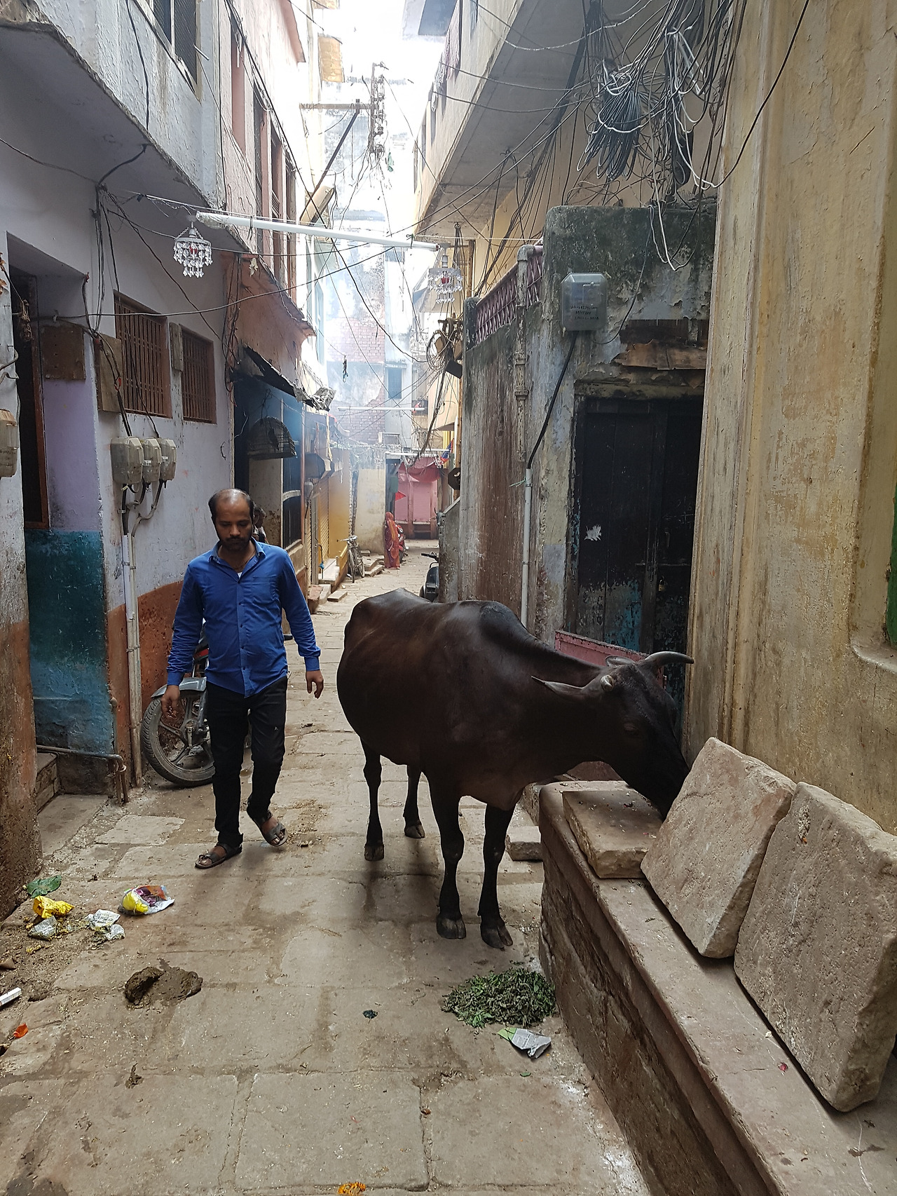 (좌) 위 단락에서 설명한 두 남자, (우) 흔한 바라나시의 사람, 소, 소의 응가, 쓰레기, 좁은 길.