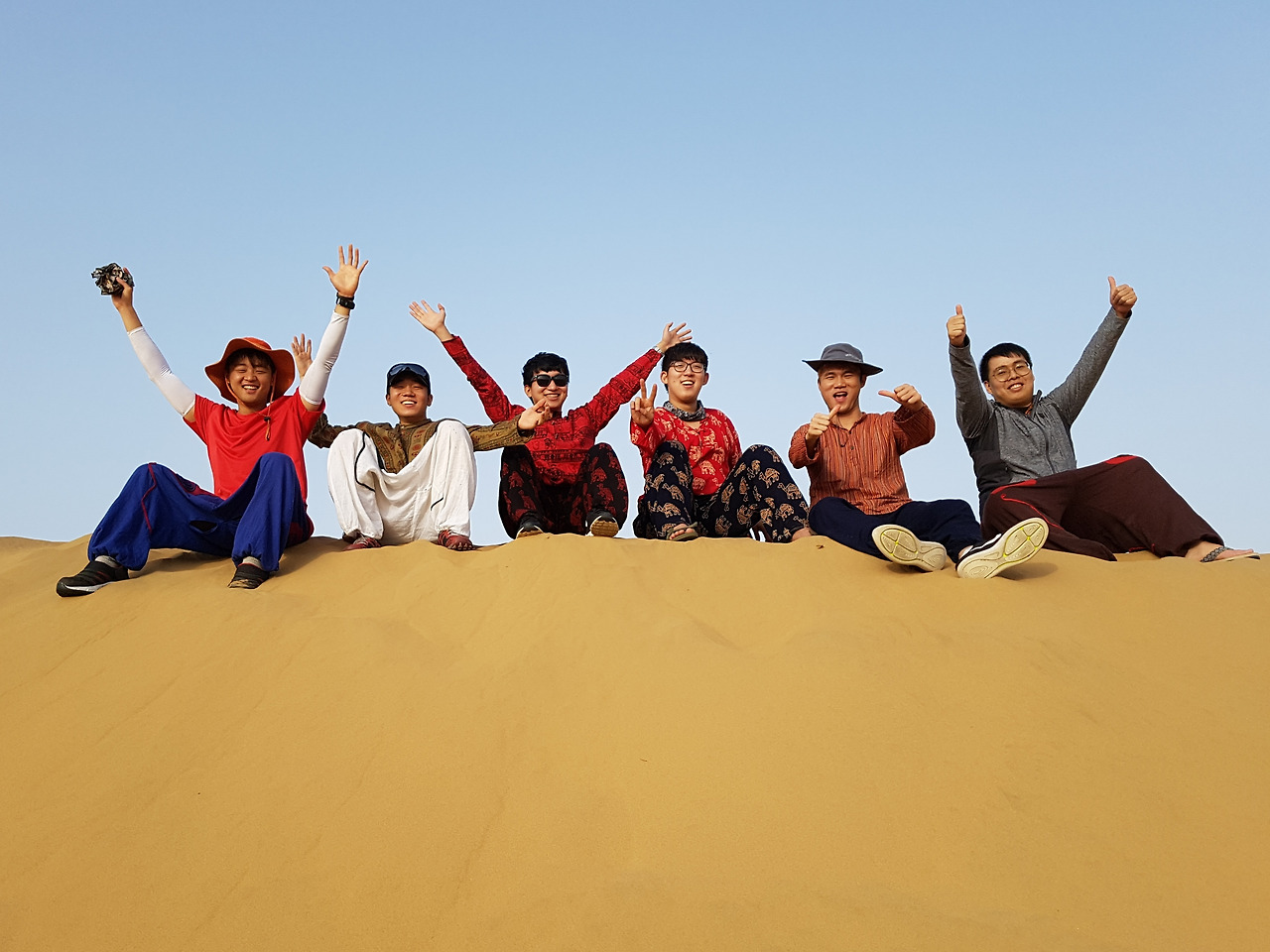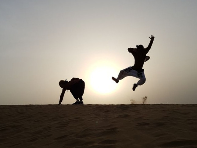 우리가 사막에 도착한 시간은 일몰이 시작되기 전이었고 역광으로 사진 찍기에 환상적인 타이밍이었다. 등 뒤로 지는 해를 배경 삼아 물 만난 물고기 마냥 앉고, 눕고, 뛰면서 사진을 찍었다.