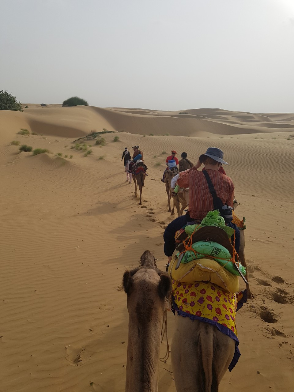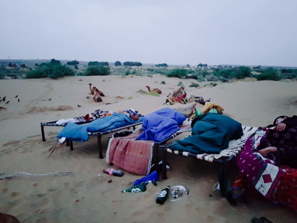 인도의 수도 뉴 델리에서 자이살메르까지는 약 18시간 동안 기차를 타고 이동해야 한다. 가장 등급이 낮은 객실은 창문을 열고 달린다. 온갖 모래, 먼지 그리고 바람은 말할 것도 없고 먼 거리를 앉아서만 가야 한다. 그래서 그나마 누워서 갈 수 있는 2등석 객실을 선택했다. 2등석 객실은 1, 2층으로 나뉘어 있었고, 베개와 이불도 제공이 되었으며 간단한 식사도 할 수 있었다.