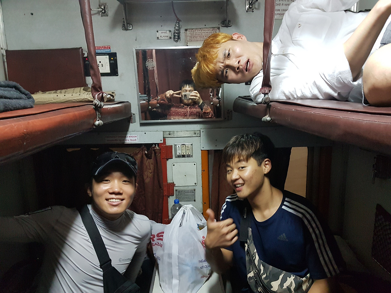 (중앙) 2등석 객실 내부, 침대 형식으로 되어있으며 여기서 18시간을 보냈다. 나 홀로 세계여행을 하는 동안 누군가와 반나절 이상 동행을 한 적은 손에 꼽을 정도다. 인도에서의 만난 나의 첫 동행들. 시계방향으로 노랑머리 본인, ROTC 후배 종현, 몽골 고비사막 마라토너 윤한, 초밥왕 현구, 다들 보고 싶다.