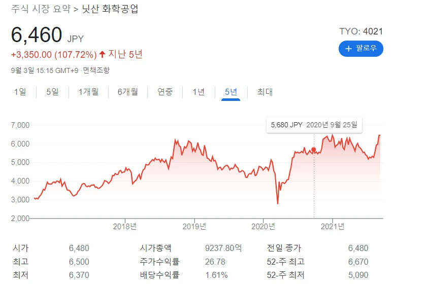 그 결과 같은 기초소재 화학분야의 매출 탑 신예츠 화학(信越化学)에 비해 매출은 1/5에 불과하지만(2021년 3월 결산 기준 신예츠 화학: 1조 4969억 엔, 닛산화학: 2091억 엔) ROE(자기 자본 이익률)은 신예츠가 10.7%인 것에 비해 닛산 화학은 17.5%다. 또한 매상도 8기 연속 성장 중이다.