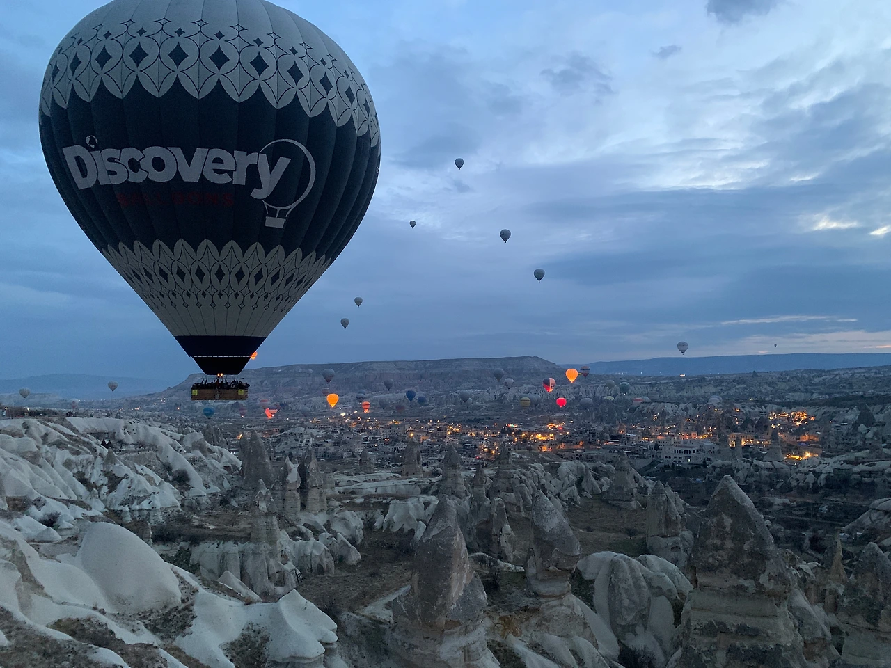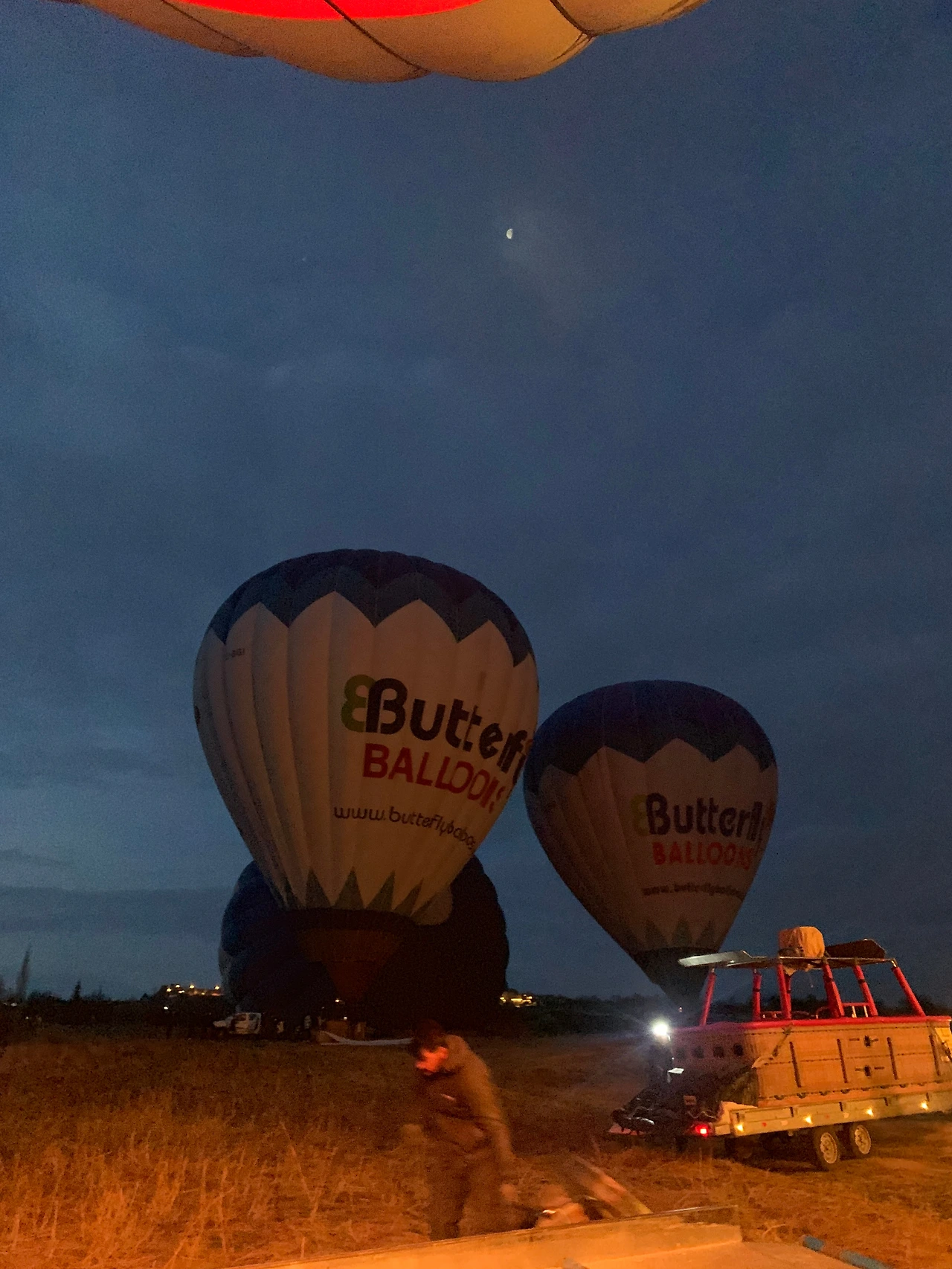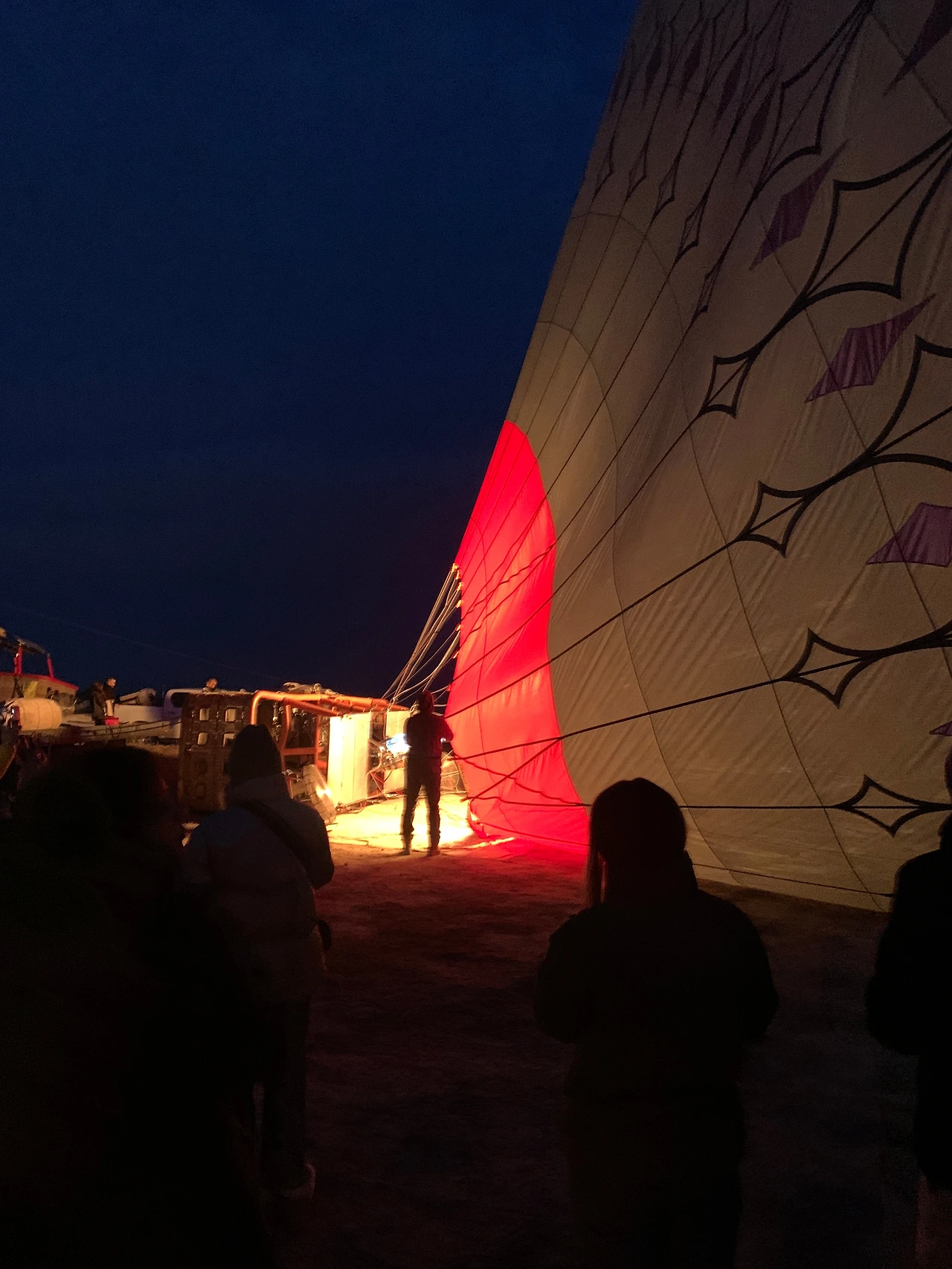 다음날 아침, 대망의 열기구를 탈 수 있었다. 열기구는 바람이 조금만 세게 불어도 안전상의 이유로 취소되기 때문에, 운이 필요했다. 운이 좋게, 1월 2일에는 열기구가 정상적으로 운행했다(괴레메에 체류한 1./1~1/4일 중, 열기구가 정상 운행한 날은 1/2일뿐이었다. 정말 천운이었다). 아침 6시에 호텔 앞에서 픽업을 하여, 열기구 회사 사무실에서 간단하게 아침을 먹고, 각자 열기구로 팀을 나누어 다시 승합차를 탔다. 가로등도 없어 어디가 하늘이고 어디가 땅인지 구분이 안 가는 어둠을 헤치며 20분쯤 달리니 수많은 열기구들이 하늘로 날아오를 준비를 하고 있었다.