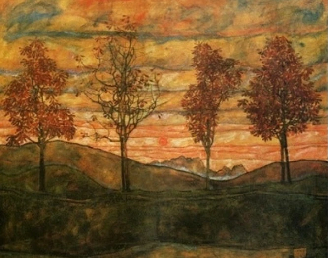 한강의 소설 <채식주의자>의 표지를 장식한 에곤 실레의 <네 그루의 나무>는 붉은 황금빛으로 물들어버린 세상과 짙은 대지의 기운에 함락된 나무의 이미지를 보여준다. 붉게 타올라 절정에 이르지 못한 채 소멸하고 말라버리는 나무의 황량함과 우울함이 <채식주의자>란 단어가 주는 이미지와 상반되는 묘한 이질감을 불러일으킨다. 개정판 표지인 푸른 배경 속 활짝 핀 흰 꽃은 확연히 다른 이미지를 보여주고 있는데 재미있는 것은 책을 읽고 나면 이 두 이미지가 거부감 없이 마음속에서 동시에 받아들여진다는 것이다.