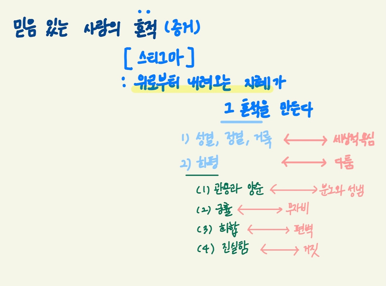 (1) 첫째는 관용과 양순입니다. 그래서 우리 야고보서에는 성내지 말라는 말씀이 강조되잖아요. “성내는 것이 하나님의 의를 이루지 못함이니라.” 나중에 보면 얘기하겠지만 거짓에 대한 말씀도 있어요. 예, 거짓이 화평을 깨죠.