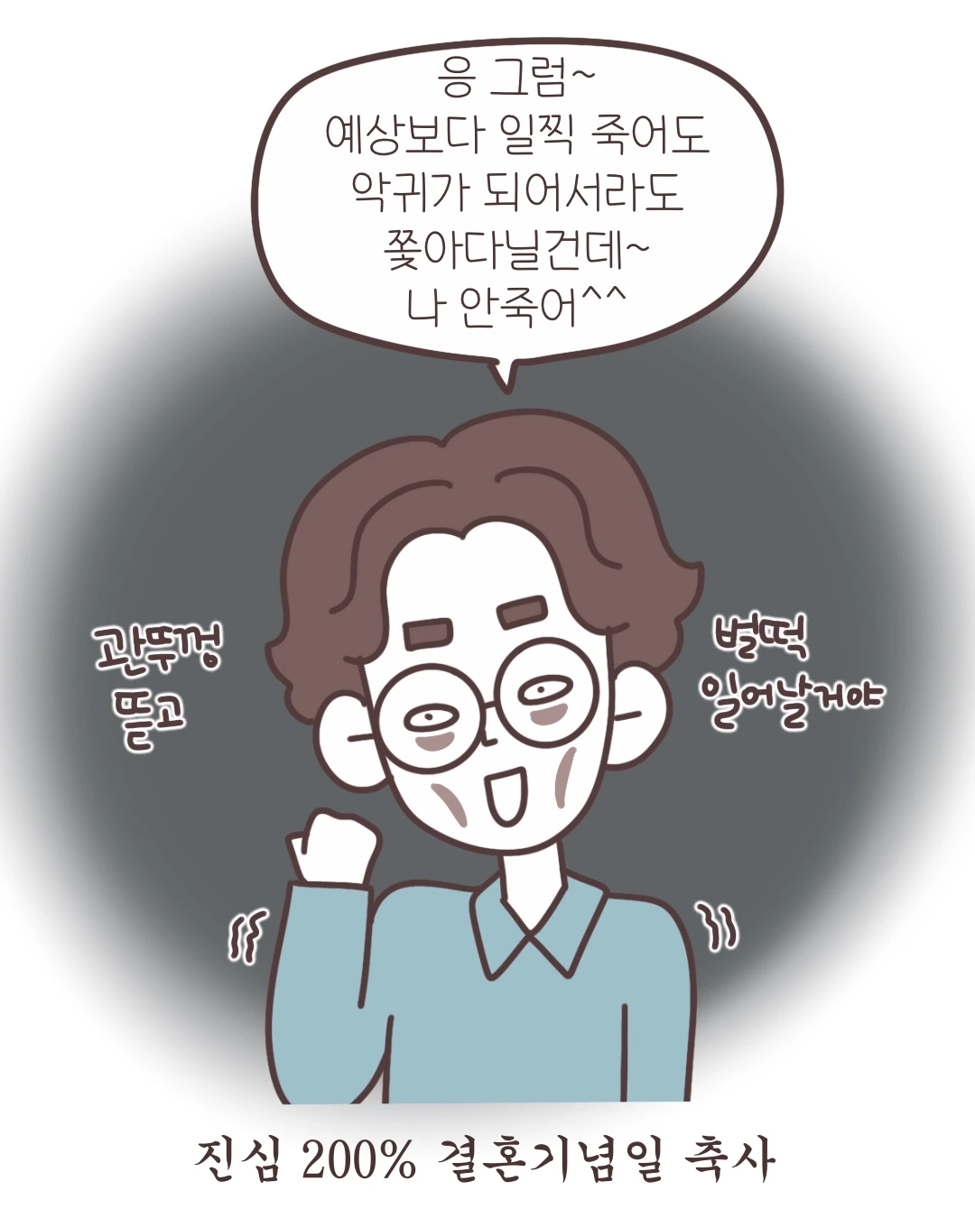 그리고 죽더라도 재혼 못하게 악령이 되서 쫓아다닐거여~
