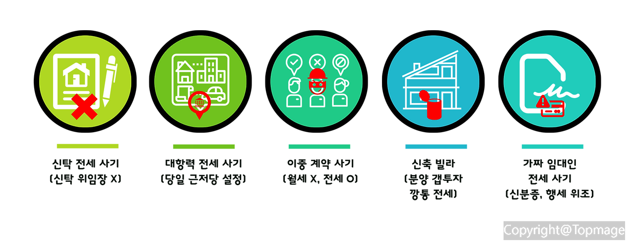 넷째, 신축 빌라 전세 사기 - 건설주가 빌라 건물을 지어놓고 분양이 되지 않으니까 전셋값 폭등이 오는 것을 이용하여 전세가격으로 투자자에게 판다. 그럼 투자자는 매매잔금과 전세잔금을 같은 날로 해서 계약을 한다. 전세입자 보증금으로 집을 사는 꼴. 여기에 중개인도 수수료를 받고 전세입자를 모집하면 꼼짝없이 당할 수밖에 없다. 이를 무피 투자라고 하는데 문제는 투자자가 이런 식으로 여러 채 매수를 하다가 전세금 하락으로 깡통전세가 돼버리면 감당하지 못하고 잠적해 버린다.