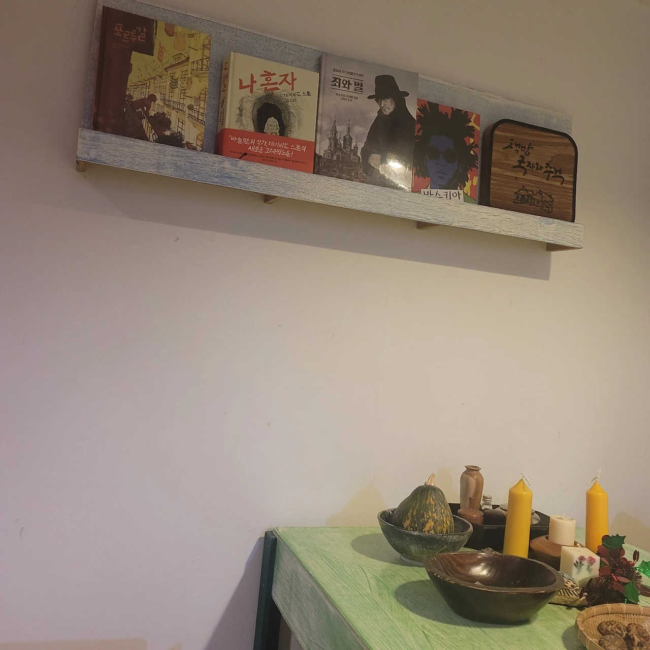 자리에 앉자마자 입에 맴돌았던 이야기를 꺼내니, 드디어 그말을 해줘서 고맙다는 듯 벌떡 일어나 그럼 좋은 밤 되라며 책방으로 사라졌다.