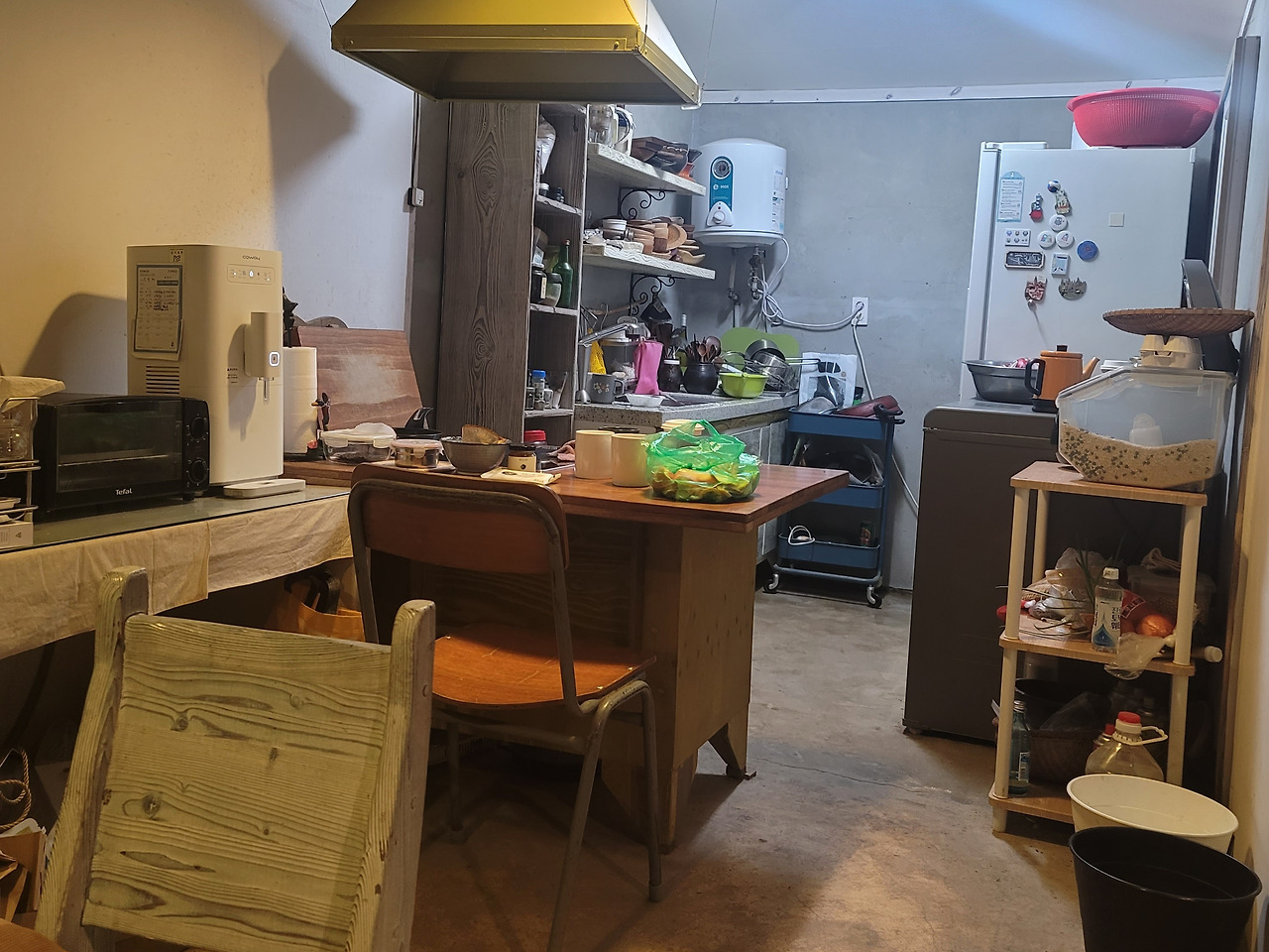 아침을 준다는 소리를 얼핏 블로그에서 찾았던 것 같은데, 메뉴는 무엇이려나. 책방 건너편의 주방은 솔직히 말하면 난장판같았다. 가장 먼저 보이는 건 직사각형의 초록 페인트칠이 엉성한 나무 식탁이다. 좁게 앉으면 족히 8명은 앉을 수 있다. 엄마가 봤으면 기함할법한 장면은 부엌이다. 온갖 나무 그릇들과 도자기들이 어지러이 기준도 없이 찬장 위에 올려져있었다. 설거지가 끝난 많은 그릇들도 자리를 찾지 못해 몸이 말린 채로 개수대 옆에 방치되어 있다. 90년 초반에 시골 학교에서나 쓰던 의자도 부엌 한 가운데 있다. 식탁 외에는 문을 열면 왼쪽으로 좌상이 있다. 아기 보행의자와 에코백, 그림, 책들이 한 데 뒤엉켜 버려진 박물관을 보는 것 같다. 좋게 말하면 앤티크이고, 나쁘게 말하면 철 지난 잡동사니가 때깔이 바랜 채로 방치된 공간. 청소 안 하고 못 하기로는 둘째가라면 서러운 나인 줄 알았건만, 역시 재야의 고수는 스케일이 다르구만…