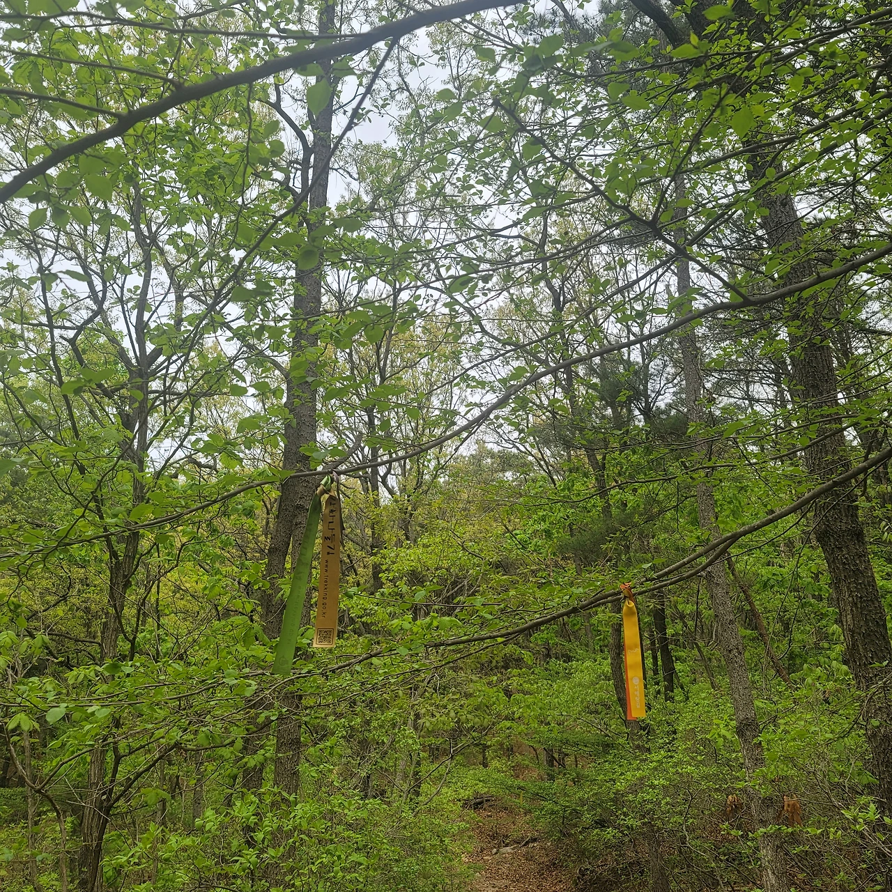 속마음이 입 밖으로 튀어나와도 전혀 상관없는 이 산책로는 아무도 없었다. 어떤 곳은 참 예쁘게 손질되어 있어 갈림길이 나오면 선택하기 쉬웠지만, 대부분은 릉까지 어떻게 가야 하는지도 모르겠다. '서해랑길' 이라는 표시가 달린, 무당집에서 쓸 법한 노랗거나 초록색 천이 나무 어딘가에 걸려있는 지를 확인하는 것이 내가 얻을 수 있는 힌트의 전부였다. 가끔은 양쪽 갈림길 모두에 묶여 있기도 했다. 와르르- 무너지는 자신감은 길치의 두려움을 이끌어냈다.