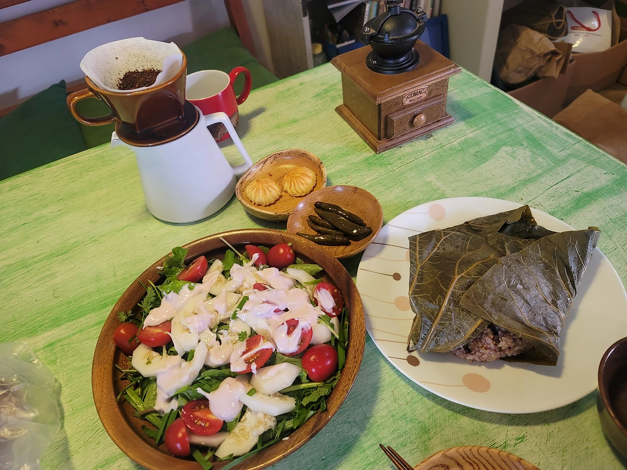 "채소 좋아해요? 오늘은 샐러드랑 연잎밥. 어서 들어요."