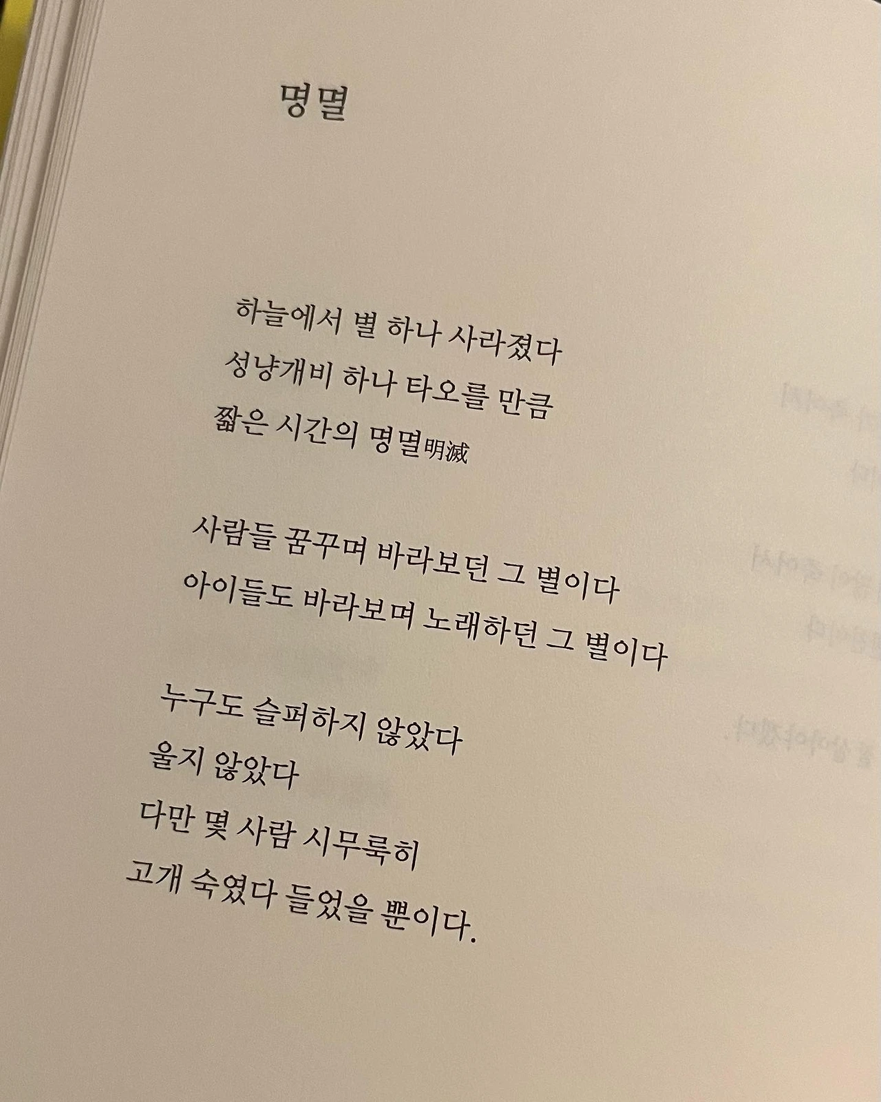 사람들을 꿈꾸게 만드는 삶이 내가 바라는 삶이고, 슬픔이 아니라 아쉬움을 남기는 삶이 내가 바라는 삶의 결말이라서. 그래서 나는 여기 나오는 별처럼 살다가고 싶다는 생각을 했다.