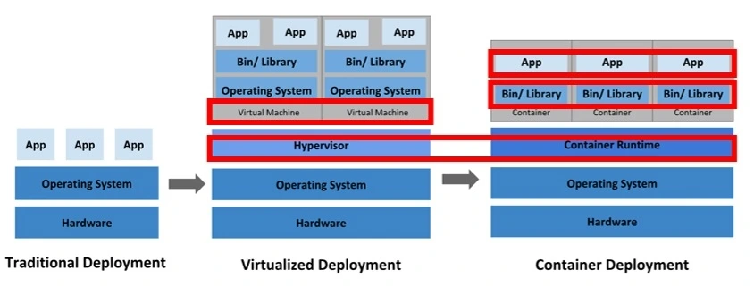 구조의 변화는 전통적 배포 -> 가상화 배포 -> 컨테이너 중심 배포로 변화했다.