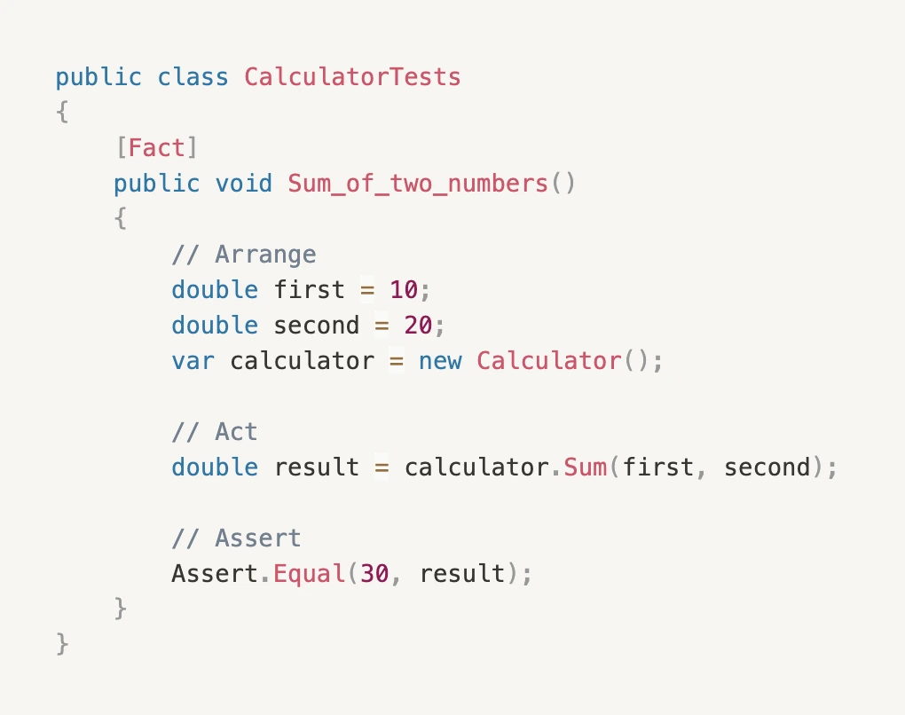 단위 테스트를 구성할 때는 AAA 패턴을 기억하면 된다. 한 테스트에 준비(Arrange) - 실행(Act) - 검증(Assert) 세 구절로 나눠 작성한다.