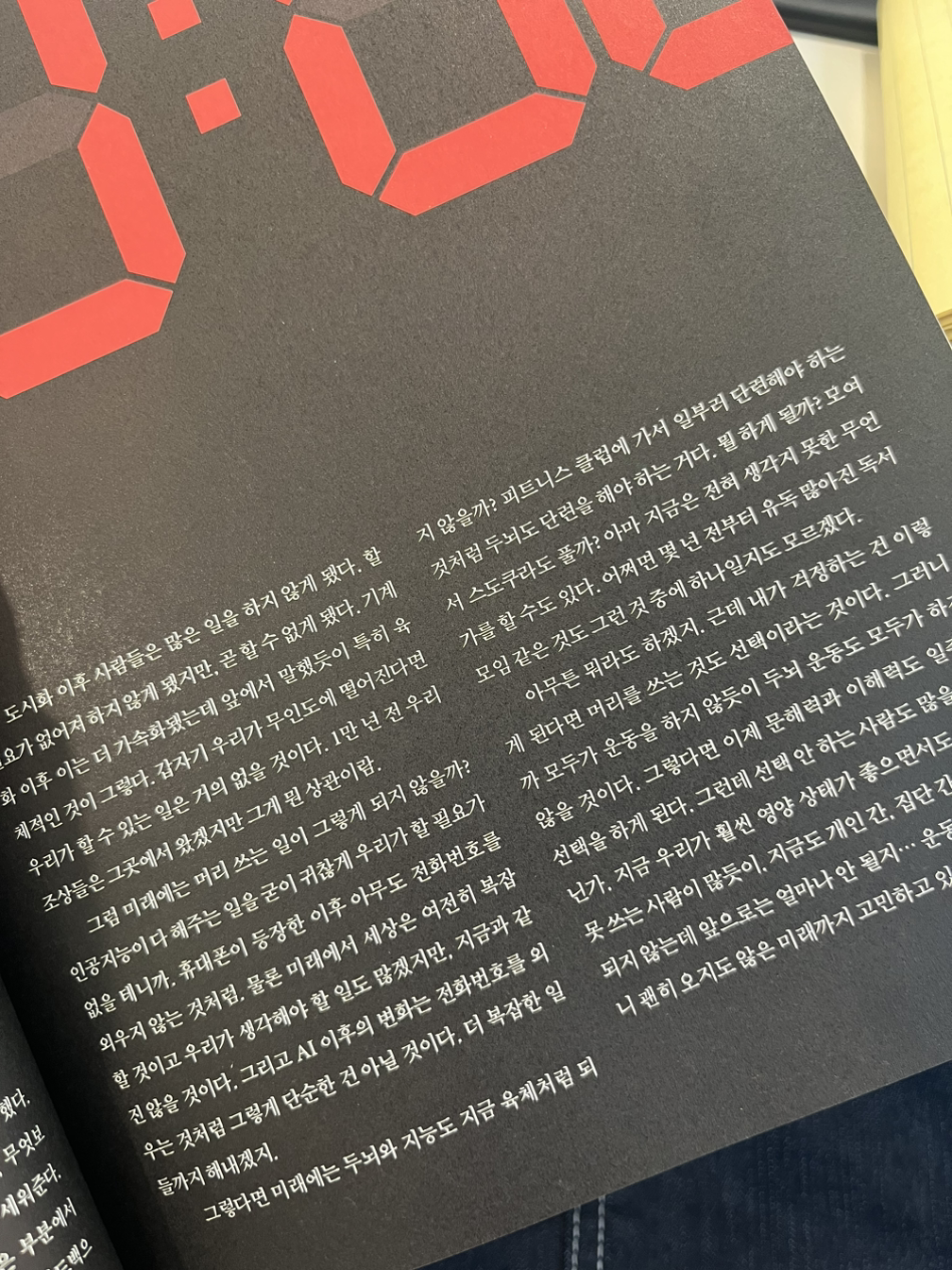 어렴풋이 상상해 봤을 때 고개가 끄덕여지는 말이었다. 두뇌도 따로 단련을 해야 할 세상을 생각하니 무섭기도 하고 나는 과연 이런 상황을 얼마나 인지하고 경계하고 있었는지 생각해보기도 하고 나아가 후세의 사람들이 얼만큼 생각하고 이해하며 자랄지 조금 걱정되기도 했다. 운동도 해야지 해야지 하면서 미루는데 두뇌는 안 미룰 수 있을까. 운동보단 나으려나.