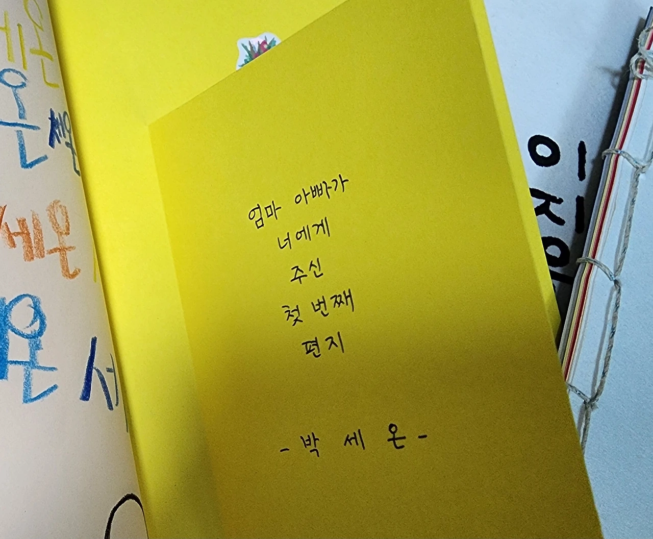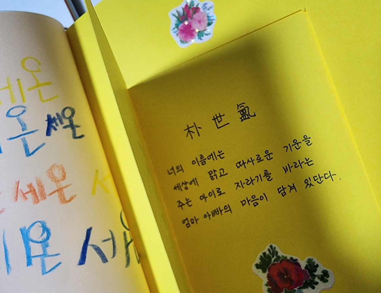 올해는 아이들의 이름을 적어 공책을 하나 만들었다. 나도 아이의 이름을 쓰고, 아이들도 자기 이름으로 예쁘게 공책을 장식했다. 그리고 그 안에는 '마음씀' 작가님이 표현하신 대로, '부모님이 아이에게 주신 첫 번째 편지'라는 내용으로 각자 이름에 담긴 뜻을 적어주었다.