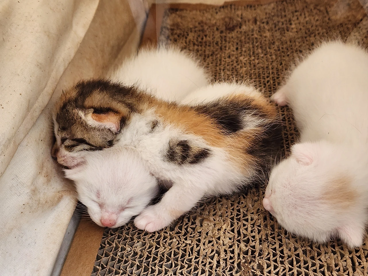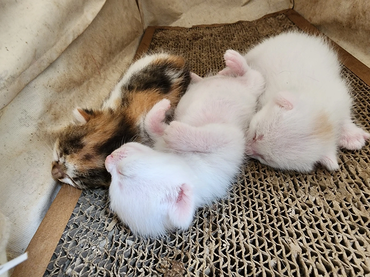 "여보! 쓰리쓰리 새끼들 이름 지었어. 똑같이 생긴 흰 녀석 중에 큰 놈은 '아리랑', 작은놈은 '쓰리랑', 그리고 엄마랑 똑같이 삼색이는 '아라리요'야."