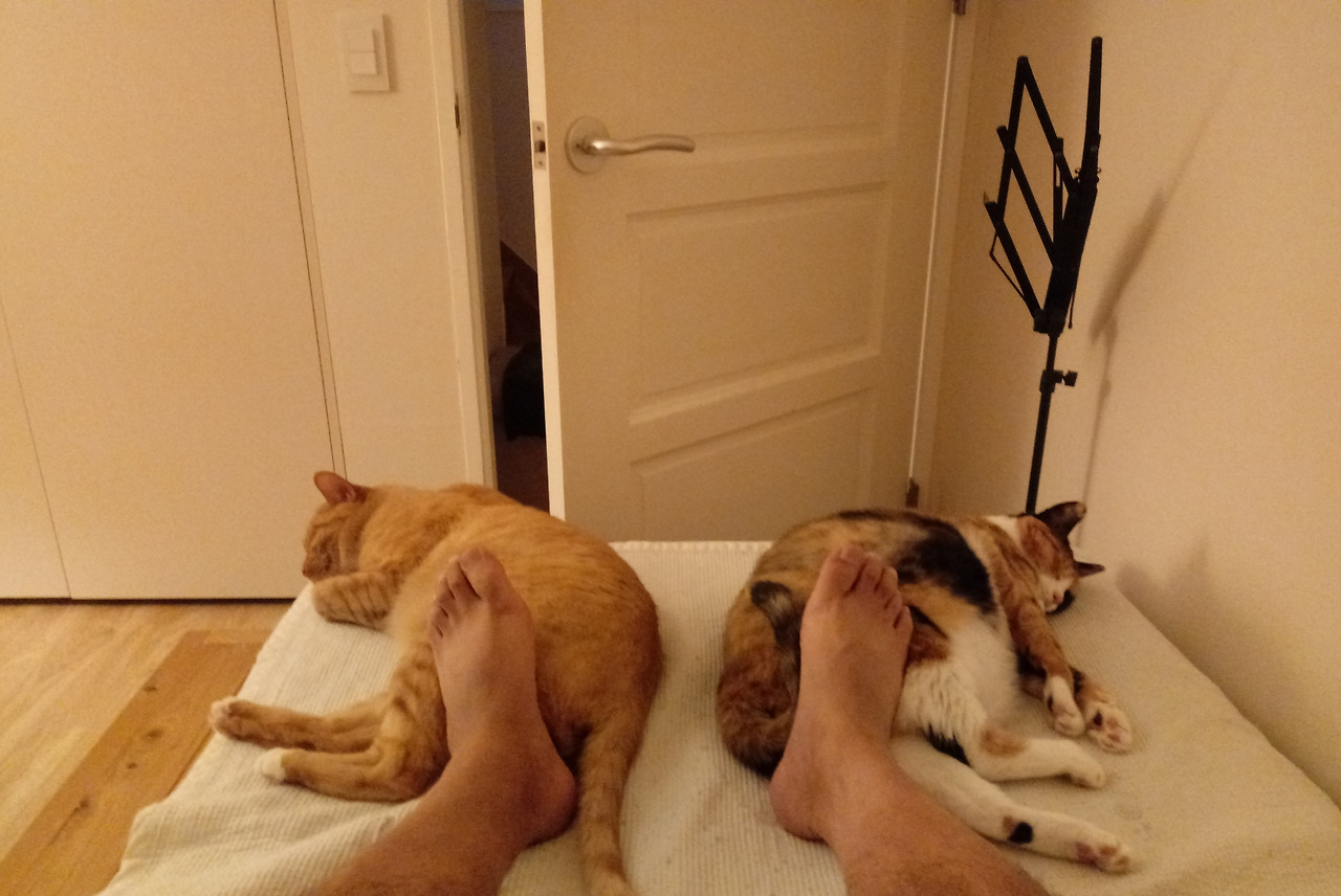 집사의 발 하나씩을 사이좋게 차지하고 자는 녀석들. 집사도 따뜻한 발난로 같다고 좋아한다. 어련하시겠수.