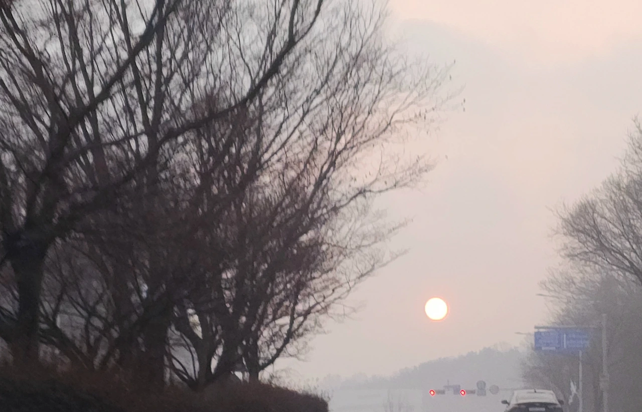 안개로 하늘이 뿌얘서 맨눈으로 뜨는 해를 본다. 흐리다고 세상만사가 다 안 보이는 게 아니다. 빨간 불이 켜져 잠시 멈췄지만, 신호등이 바뀌듯 곧 초록초록한 세상이 오리라.