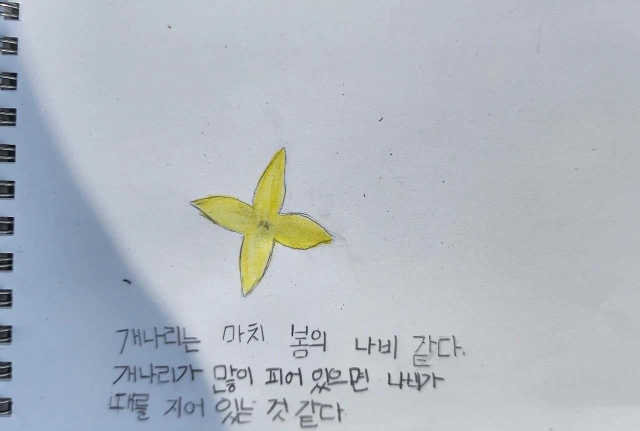 이 아이들이 더 어렸던 일곱 살 때도 저는 아이들과 개나리꽃으로 자주 놀았습니다. 통꽃이라 마른 솔잎을 꽃 안에 끼워 머리핀을 만들어 주기도 했고, 속이 비어 있는 가지를 토막토막 잘라서 목걸이를 만들기도 했고요. 꽃들을 따서 미끄럼틀 위에서 날리면 헬리콥터처럼, 나비처럼 날아가 아이들 머리 위에 살포시 내려 앉기도 했지요.벌써 몇 해가 지나고 산길을 오르는 발은 저보다 더 커졌는데도, 아이들은 봄꽃 따라 노란 봄빛물이 드네요, 개나리처럼, 예전의 그 병아리들처럼.