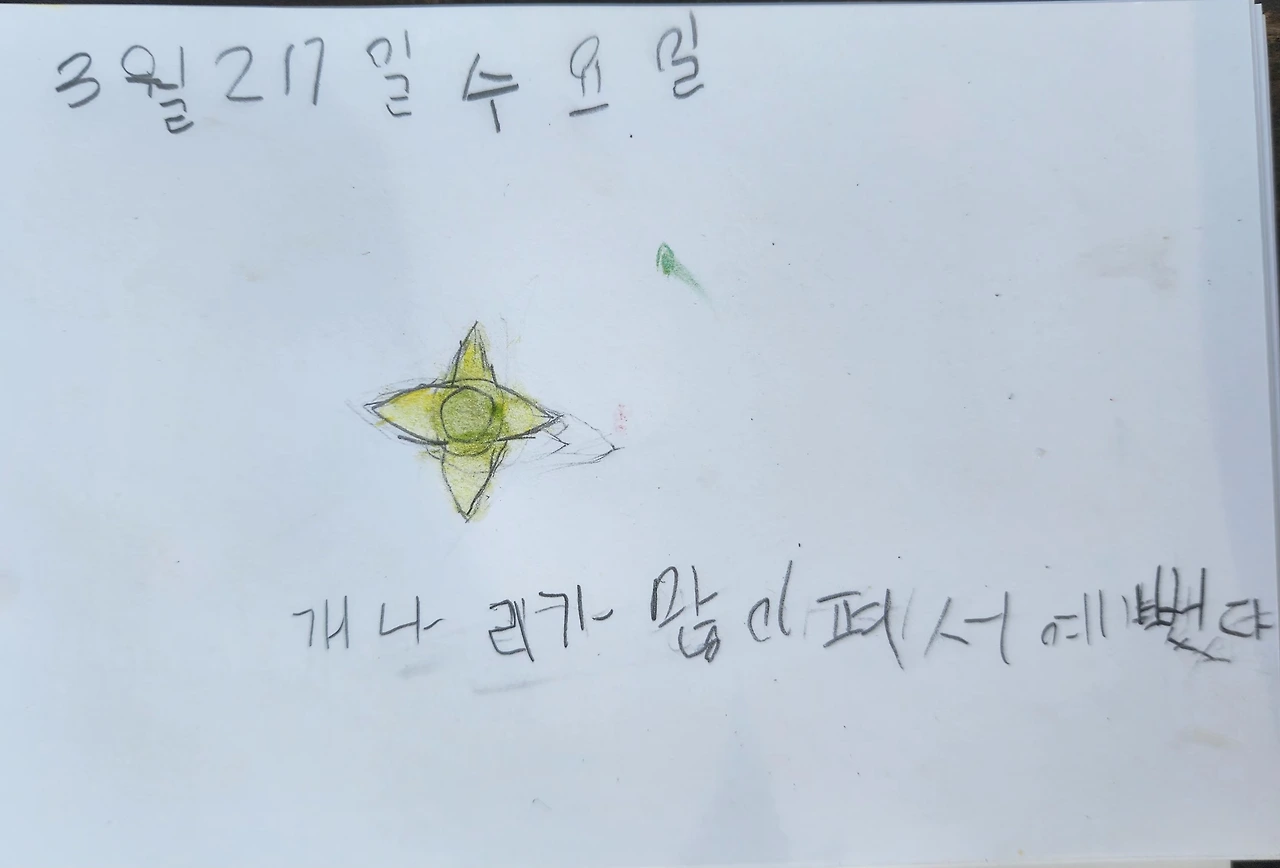 이러구러 정상에 도착합니다. 배를 깔고 엎드려 그리는 녀석, 뭐라고 써야 할지 모르겠다는 녀석, 노란색 꽃잎을 파란색 물감으로 칠하고 까르르 웃는 녀석. 자세는 다르지만 지난번에 한 번 해봤다고 주저함은 없습니다.