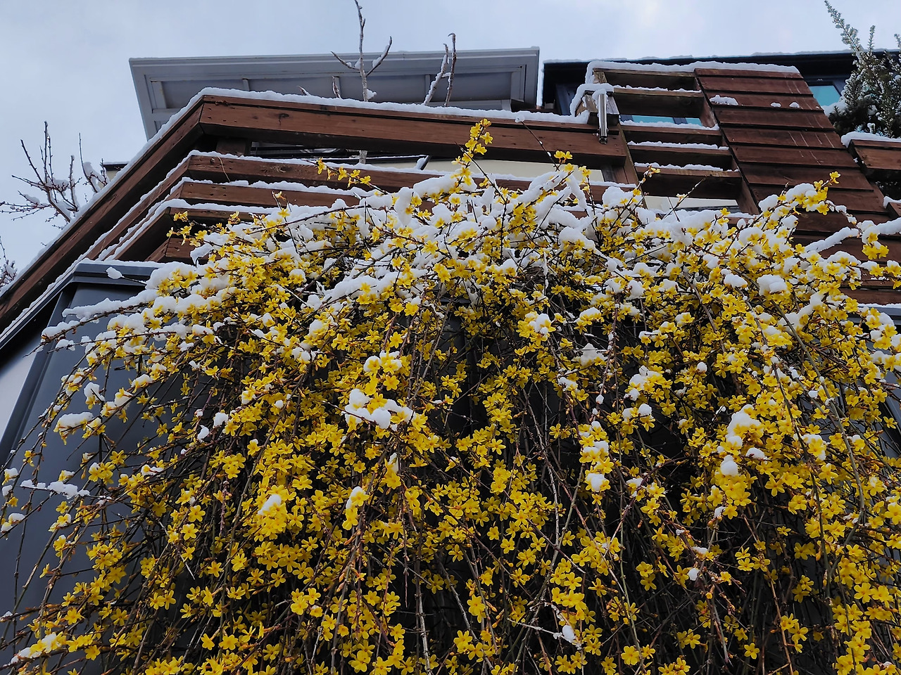 세상, 뭐든지 쉽게 얻을 수 있는 것은 없다지만 봄만큼 쉽게 오지 않는 게 있을까. 이름에 떡하니 '春'자를 달고 있는 입춘이지만 입춘 추위는 꿔다라도 한다는 말도 있고. 얼마나 간절하면 봄을 부르는 염원을 집집마다, 대문마다 붙여 놓을까. 입춘 절기 지나도 봄은 쉽게 오지 않아. 살그머니 꽃대라도 올리려 하면 '너 지금 나오면 매운맛 좀 볼걸?' 협박이라도 하듯 꽃샘추위가 오고. 올해는 심지어 3월 중순에 폭설이라니. 마냥 해맑고 화사했던 노란 영춘화는 눈을 뒤집어쓴 뒤 하얗게 질려 버렸더라.