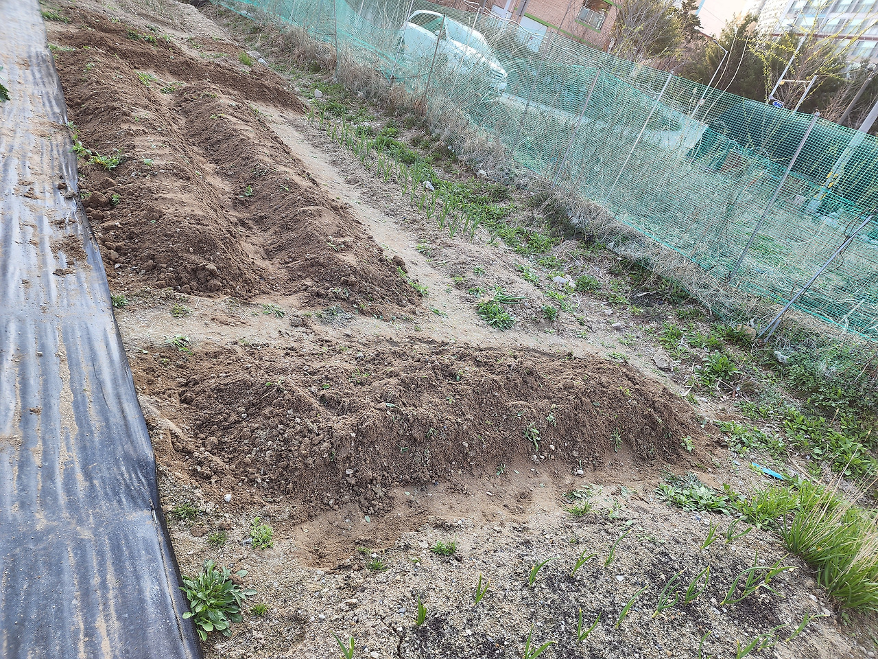 두 줄짜리 고랑은 주인집 것. 내 건 딱 사람 하나 누울 정도 크기의 밭이다. 농사라기보다 소꿉놀이 하는 것 같겠다.