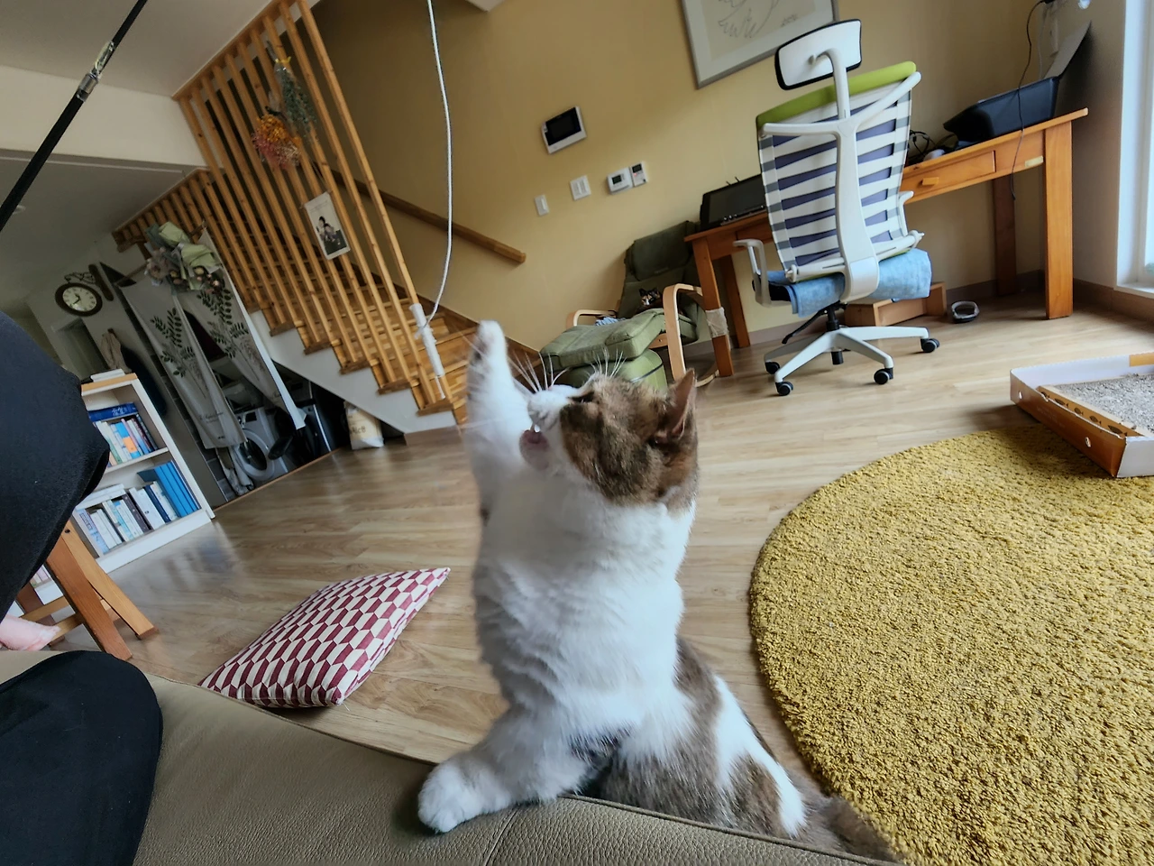 막내는 '놀이'라면 사족을 못 쓴다. 먹지는 않아도 놀지 않으면 못 사는 냥이다. 맨날 똑같이 흔들어주는 실꼬리가 뭐가 그리 재미있는지. 놀이감 위에 발을 얹어 놓고 빤히 쳐다보는 간절한 눈빛은 사춘기 귀차니즘이 충만한 딸내미까지 일으켜세우는 능력이 있다.