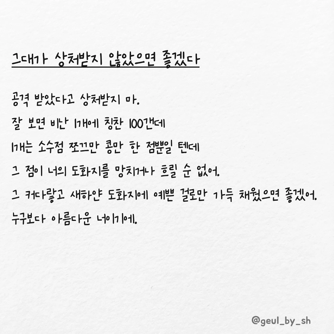 하지만 대게 그런 사람들을 봐보면 스스로가 힘들지 않아 봐서, 자존감이 낮아서, 시간이 많아서 등 이러한 경우가 많다. 어차피 다른 결의 사람들이 잘 모르고 함부로 하는 말에 큰 의미를 두지 않았으면 좋겠다.