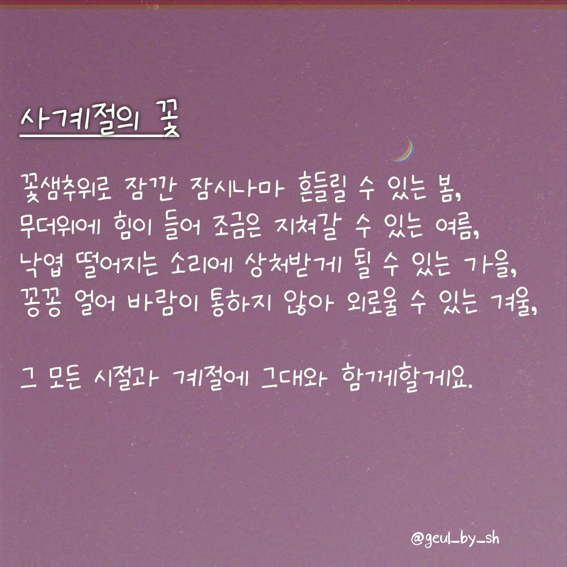 꽃밭은커녕 강아지풀 하나 없는 현실이라도 결국엔 피어오를 꽃 한 송이가 있다는 것을 항시 잊지 말고 기억하자.