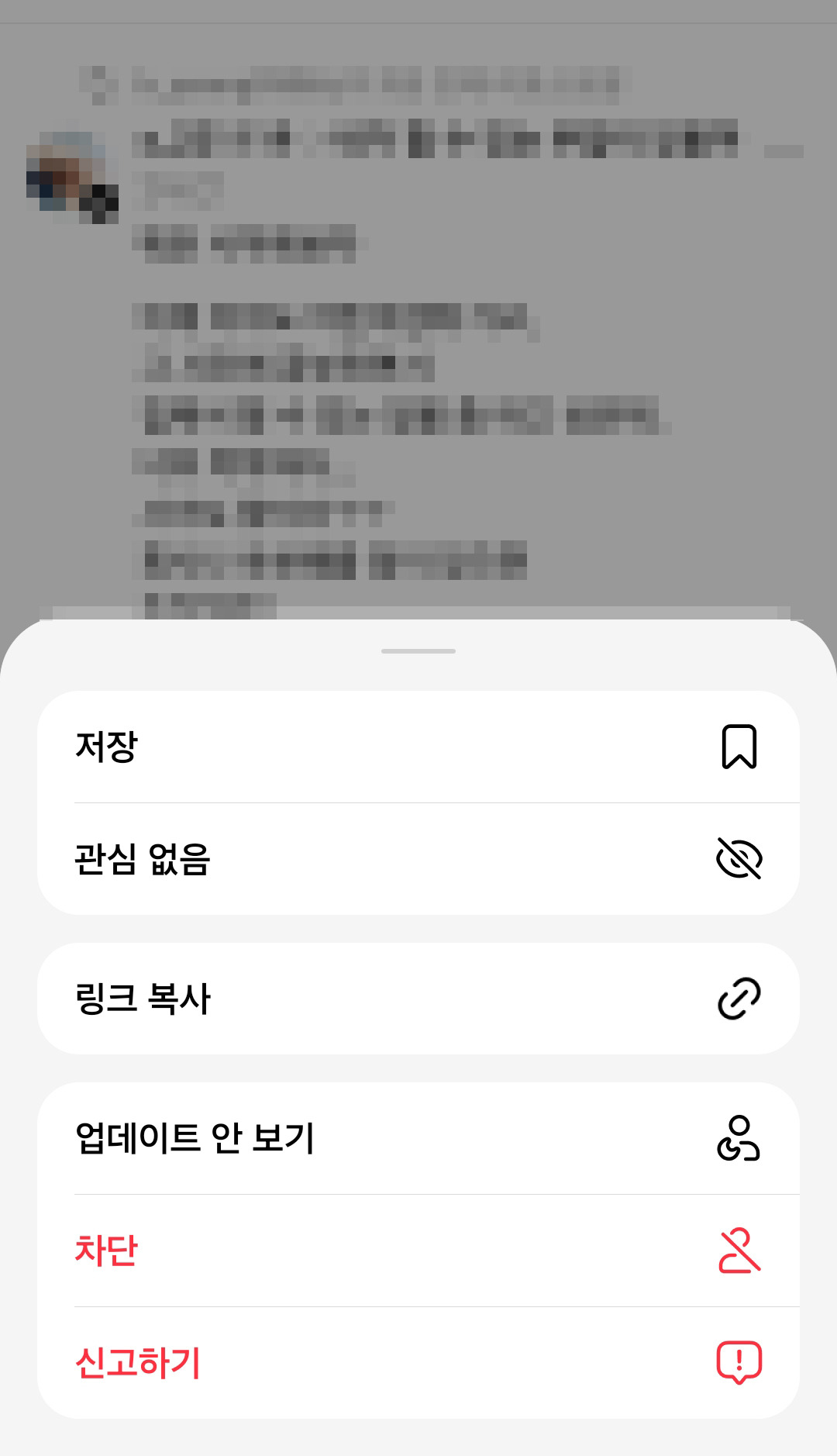 알고리즘에 따라 다양한 글을 볼 수 있다. 내 홈엔 글쓰기에 대한 글이 많다. 관심이 없는 글은 아이디 옆에 점 세 개를 눌러 '관심 없음'을 누르면 된다. 좋은 글귀는 따로 저장을 해서 보관할 수도 있다.