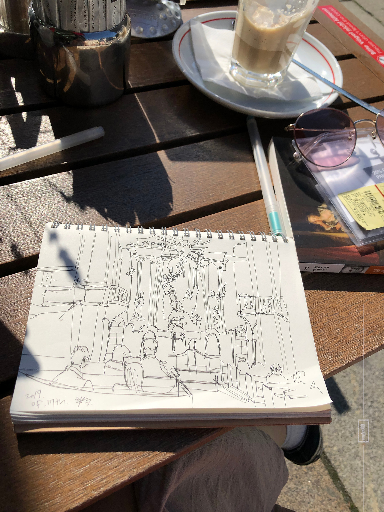 한국에서는 잠깐 멈춰 설 시간조차 없다. 이렇게 노천 카페에 앉아 성당을 그릴 생각은 못 하겠지. 잠시 쭈그려 앉아 숨을 고르고 있다면 아마 오지랖 넓은 누군가 물어볼지도.