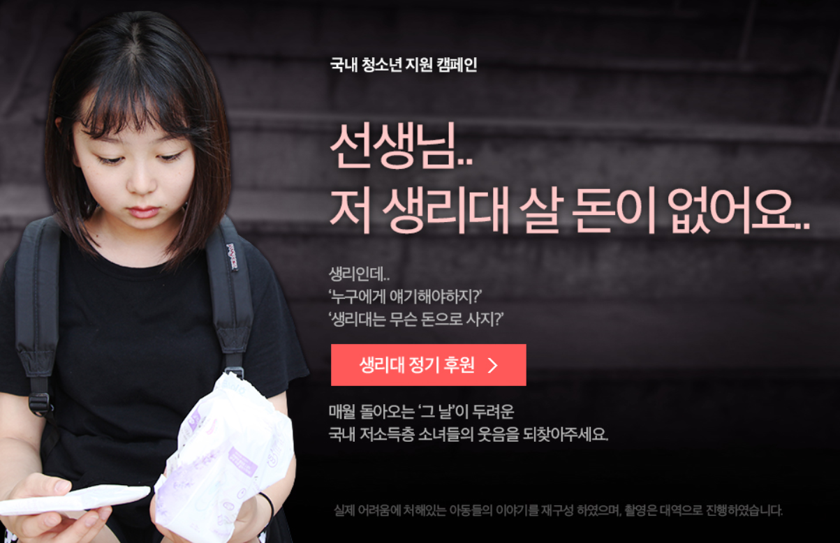 나는 취업 준비할 때를 떠올렸다. 대부분의 사람들이 그렇겠지만 취준생은 커피 한 잔도 마음 편히 못 마신다. 그런데 생리대는 어떨까. 여성 생필품인 생리대는 팬티라이너의 경우 1팩이 3천 원대에서(세일 시) 6천 원대까지 다양하다. 오버나이트(기저귀 수준의 불편함)는 몇 개 들어있지도 않으면서 비싸긴 홍대 파스타만큼 비싸다. 당시 친구가 가끔 보내주는 스타벅스 기프티콘에 "황송합니다 마마" 장문의 카톡을 보냈던 내게도 생리대 값은 대단했다.