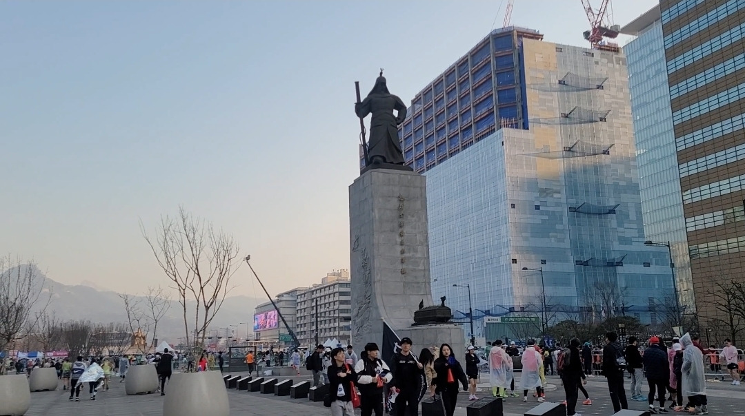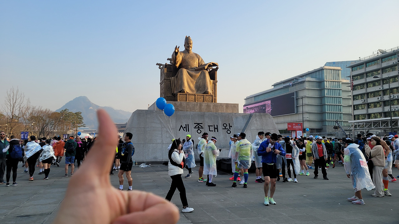 2023년 동아마라톤 대회 진행 MC 배동성의 멘트에 나도 모르게 발을 구르고 머리부터 발끝까지 스트레칭을 시작했다. 왼쪽 옆구리 근육을 늘리기 위해 오른쪽으로 90도 수그렸더니, 광화문 광장 앞 이순신 장군 동상의 머리가 왼쪽 위로 향한다. 이번에는 왼쪽으로 90도 수그렸더니 세종대왕 동상의 머리가 오른쪽 위로 향한다. 대한민국의 자랑스러운 두 위인(Great man) 앞에서 스트레칭은 처음이라 괜스레 조심스럽고 어색했지만, 두 분이 입가에 미소를 띠며 나를 응원하고 있다고 강제 상상을 하며 준비운동을 마무리했다. 이어서 긴 거리를 달려야 할 나의 육체를 위해 준비해 온 연료들을 입속으로 부어 넣었다. 내 몸에 가까운 물인 포카리스웨트 0.5캔, 잠들어 있는 세포들을 깨워 줄 카페인 주입용 레쓰비 0.5캔, 러닝에 필요한 에너지를 충전해 줄 파워젤 1개 정도다 (다음부터 커피는 마시지 말아야겠다. 10km 부근 화장실이 너무 급한데 화장실이 없어 고생 좀 했다) 이때 "출발 5분 전입니다" 안내를 듣고 주변을 둘러보니 사진 찍는 사람, 발 구르는 사람, 스트레칭하는 사람 등 각양각색이다. 출발 1분 전입니다. 선두그룹 곧 출발하겠습니다. 멘트를 듣고 나니 심장이 반응했다. 나는 초보자가 뛰는 마지막 그룹에 속해 있어서 선두보다 25분 뒤에 출발하지만, 마치 내가 지금 출발하는 것 같은 두근거림이었다. 앞 그룹에서 수천 명의 사람들이 순차적으로 함성을 치며 달려 나가는데 심장 근육이 쫄깃해지면서 세포들이 반응했다. (올드하지만, 2002년 길거리 응원 때와 비슷한 느낌을 받았다) 그렇게 가슴 뛰는 분위기와 기분 좋은 흥분감을 온몸으로 느끼면서 스타트(Start) 라인을 넘었다.