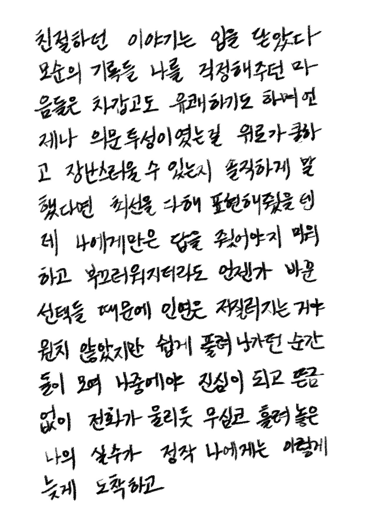 그 사람을 생각하면 조금 얄밉기도 하고 아쉽기도 하면서 부끄러워진다. 그 실수가 내 삶에 이렇게 깊이 박힌다는 것에 놀라기도 한다. 그렇지만 지금 내가 할 수 있는 건 무엇인가. 다시 연락해서 잘못했다고 한들 부러진 인연을 다시 이어 붙일 수도 없는 노릇이다. 우리의 시절은 이미 다 한 것이니까.