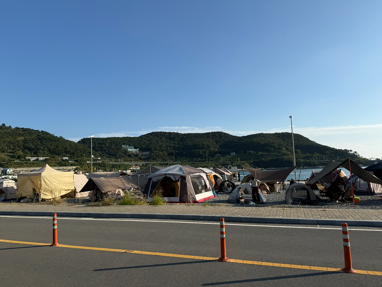 남편과 점심을 먹고 천성항에 갔다. 도착하자마자, 빼곡하게 주차되어 있는 차들과 수많은 텐트들이 눈길을 끌었다. 이렇게 많은 사람들이 모여 캠핑을 할 수 있는 곳이 있다니, 놀라울 따름이었다. 남편에게 물어보니 이곳은 노지 캠핑과 낚시 포인트로 유명한 곳이라고 했다.