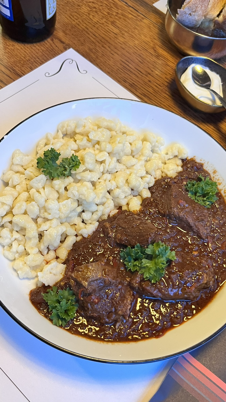 오자마자 허기진 배를 채우기 위해 레스토랑을 찾았다. 모든 상점들이 이른 저녁에 다 닫아서 좋은 시작점을 찾기 어려웠지만 운 좋게 맛도 좋고, 주인 분들이 유쾌한 곳을 찾았다. 게다가 오빠의 추천메뉴 '굴라쉬'를 주문할 수 있었다. 나는 밀가루를 뭉쳐놓은 형태의 음식을 좋아하지 않는다. 싫어하는 편에 훨씬 더 가깝다. 그런데 사진으로 보니 '굴라쉬'는 뭉친 밀가루를 소스에 찍어먹는 형태였다. 와, 메뉴에 있지만 내게는 존재하지 않는 메뉴다. 그런데 스위스에 다 와 갈 무렵부터 오빠는 눈이 반짝반짝했다. 그 음식에 대한 좋은 기억이 있는지 내게 꼭 먹이겠다는 의지가 가득했다.