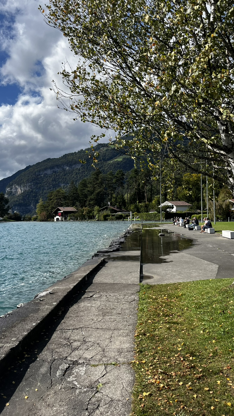 우리는 조식에서 슬쩍 해온 프렛즐 2개, 바나나 2개를 풀밭에 풀어놓고 옷을 훌훌 벗었다. 오빠가 먼저 들어가려 물로 다가가는데 어떤 여자분이 사랑스러운 미소를 띠며 약간 황급히 물에서 나오고 있었다. 실오라기 하나 걸치지 않은 채 수영을 하고 있었던 것이었다. 뭍으로 손을 뻗어 옷가지로 몸을 가린 채 눈 깜짝할 새 옷을 입었고 귀엽게 눈을 찡긋하며 우리의 차례를 알렸다. 보니까 스위스의 대부분 모든 호수는 쉽게 입수할 수 있는 계단이 있거나, 수영장처럼 사다리가 설치되어 있었다. 그리고 한 2m 정도 더 물로 들어가면 혼자 딱 서있기 좋은 다이빙대도 있고. 그런 데서 둥둥 뜨는 자유수영을 할 줄 몰라 걱정이 좀 되었는데 그럴 필요가 없었다.