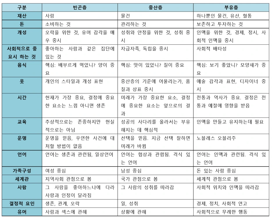 그러던 중 최근에 계층에 대한 재미있는 글을 하나 읽었는데 위의 프레임 논리가 각 계층에도 적용되는 것 같아 느끼는 바가 많았다. 특히 최근에 부동산과 기득권층의 비리에 한국에서 하도 갑론을박이 많은지라 내용이 흥미롭게 다가왔는지도 모르겠다. 주변에 몇 공유를 했는데, 그 반응이 참 가지각색이었다. 같은 내용을 보고 성공을 다짐하는 사람도 있고, 내용이 안 맞는다며 내용을 부정하는 사람, 정치적 프레임에 끼우는 사람도 있었다. 여기서 포인트는 자신이 처한 상황과 관점에 비추어 (그리고 이 관점은 아마 자신이 살아온 세월과 경험으로 이루어진) 오롯이 말하고 있다는 것이다. 같은 도표를 보고도 사람들의 반응이 저렇게 다양하니, 경험과 이해의 폭이 얼마나 중요한지 느끼는 바가 컸다. 저자는 이 부분을 집는다. 내가 속한 계층이 아닌 경우 그 외 계층의 행동을 이상하다고 거부감을 느끼면 안 되는 것이, 서로의 계층을 경험해 보지/선택해 보지 못했기 때문에 발생하는 일이라는 것이다. 같은 하늘 같은 시대를 살고 있지만, 다른 세상에 있기 때문에 서로의 다름을 전혀 이해하지 못한다. 이쯤 되니 기득권층에서 민중을 개돼지라고 표현한 것도 이해가 갈 정도다. 여기서 말하는 부유층의 행동양식은 또한 영국과 한국이나 큰 맥락에서 차이도 없어 보인다. 다만 영국이 사회적 관습과 경제적 배경을 바탕으로 이를 오랜 시간에 걸쳐 층을 더 견고히 했다는 정도? 어쨌든 위에 언급한 계층의 불문율은 요즘의 시대상과 내가 경험하지 못한 삶을 적나라하게 보여주는 도표라 흥미로우면서도 씁쓸했다.