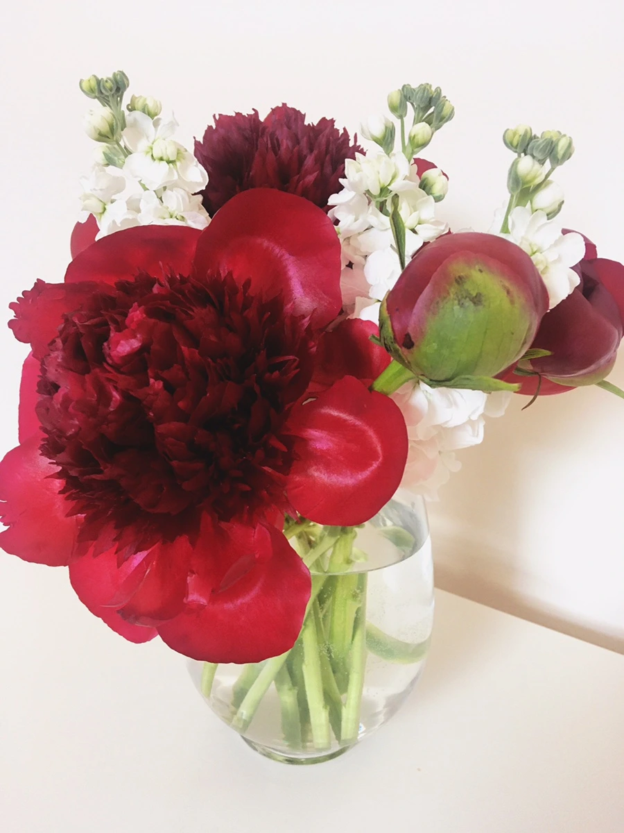 작약을 드디어 구했다. 작약은 보통 4월 말 정도부터 나오기 시작해서 5월, 6월까지만 나오는 꽃인데 지난 두 달간 구하기 너무 힘들었다. 그런데 우연히 오전에 마트에 가던 날 알디에서 생각지도 못하게 작약을 채워 넣는 것을 보고 얼른 집어 왔다. 같이 꽂아 놓을 스톡(stocks, 주식과 스펠링이 같다)이라는 꽃과 함께. 마침 내 퇴사와 겹쳐, 발견하게 된 것을 보니 이 적작약은 나와 함께할 운이었다. 기념비적인 꽃이다. 하루 만에 만개한 작약을 거실 오며 가며 보니 기분이 두 배는 좋아진다.