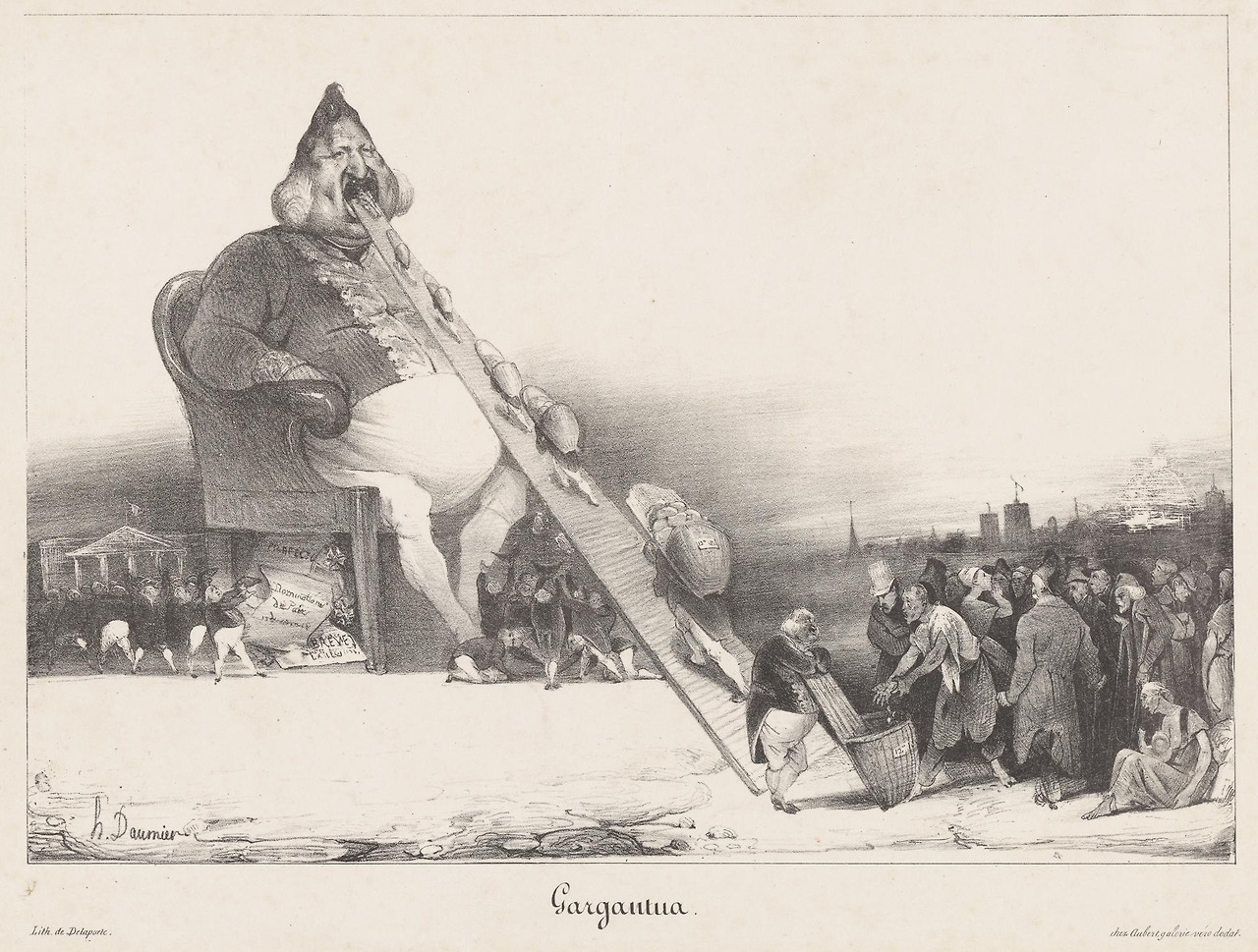 1831년 프랑스, 주간지 ‘라 카르카튀르 La Caricature’에 충격적인 삽화가 실렸다. 노동자들의 금화를 박박 긁어모은 바구니들이 한 거구의 남성 입안으로 끊임없이 올라간다. 그의 이름은 ‘가르강튀아Gargantua’.¹ 농민들의 금화를 먹은 가르강튀아가 훈장을 배설하면, 부르주아들은 이를 받아먹으려 난리다. 그림이 발표되자 경찰은 인쇄소를 털어 해당 석판을 몰수했다. 가르강튀아가 루이 필립 1세를 지칭했기 때문이었다. 그걸 어떻게 아느냐고? 저 두둑한 얼굴을 봐라. 루이 필립을 희화화하는 서양 배 형상을 하고 있지 않은가.²