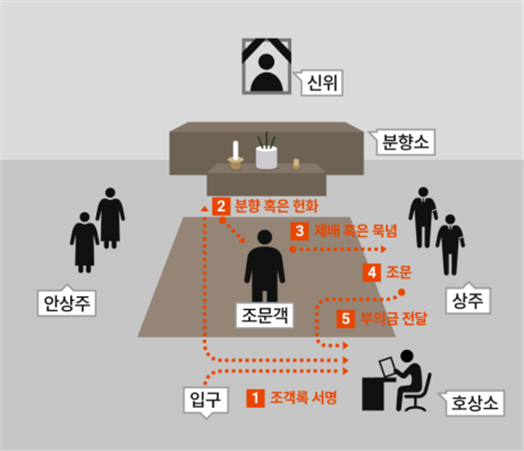조객록 서명 > 분향 혹은 헌화 > 재배 혹은 묵념 > 조문 > 조의금 전달