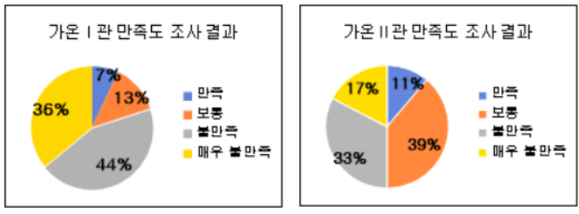 각 관 거주 학생들의 기숙사 만족도 조사 결과를 취합한 결과, 71건의 응답 중 가온Ⅰ·Ⅱ관 모두 ‘매우 만족한다’는 답은 없었다. 가온Ⅰ관의 경우 ‘불만족’과 ‘매우 불만족’이 전체의 80%였고, 가온Ⅱ관의 경우 ‘보통’이라는 답변이 39%로 가장 높은 비율을 차지했다. 이러한 응답의 이유로는 시설 노후화 및 수질 문제, 비효율적인 기숙사 운영 시스템 등 의견이 다양했다. 먼저 가온Ⅰ관은 시설 노후화로 인한 누수·해충 및 먼지 발생에 대한 불만이 가장 큰 것으로 나타났다. 그중에서도 나무 창틀과 서랍의 교체 및 보수가 시급하다는 의견이 많았다. 둘 다 연식이 있어 가구의 기능을 제대로 수행하지 못할뿐더러, 방 안 먼지를 유발하는 주원인으로 꼽히기 때문이다. 특히 창틀은 이음새가 부식되어, 청소 시 이물질과 나뭇조각이 함께 닦여 나와 청결을 유지하기 어렵게 한다. 책상 옆 3단 서랍은 여닫을 때마다 나무 가시에 다치는 경우가 많아, 교체가 어렵다면 아예 없애자는 주장도 있었다. 이외에도 방바닥의 장판 들뜸, 제품 특성상 세척이 불가한 방염 커튼, 파손된 공용 샤워기 헤드 등 기숙사 시설의 거의 전 범위가 불만 요소에 해당했다. 나아가 면적 대비 수용 인원이 적고 생활 불편이 많은 가온Ⅰ관을 철거 후 재건축하자는 의견도 있었다. 이처럼 많은 가온Ⅰ관 거주 학생이 시설 노후화 문제를 실감하고 있었다. 기숙사 건물의 노후화는 거주하는 학생의 건강과 직결된다는 점에서 경각심을 가질 필요가 있다.