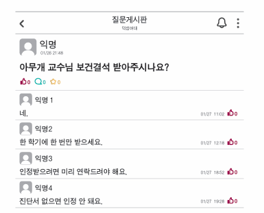우리대학은 2013년 2학기에 보건결석제를 도입했다. 초기에는 교내 건강증진센터에서 진료받은 후 전산상에서 보건결석을 신청하고, 센터에 재방문하여 증명서를 발급받아야 했다. 하지만 2015년 5월부터 건강증진센터 업무량 증가와 이용 불편을 해소하기 위해 재방문 절차를 삭제하고 인터넷상에서 증명서를 발급하는 형식으로 변경했다.4) 2017년 2학기부터는 절차가 간소화되어 전자출결시스템을 통해 보건결석을 신청할 수 있다. 학교의 원칙을 따르면, 보건결석은 코로나 확진이나 질병 등에 적용되는 유고결석과 달리 증빙서류가 필요하지 않고, 학기당 3회 22일 간격으로 사용할 수 있다. 하지만 이 원칙이 출석을 보장하는 것은 아니다. 공결 승인 여부는 전적으로 교수의 재량에 의존하기 때문이다. 어떤 교수는 학기당 1회만 공결을 승인하고, 어떤 교수는 사전에 승인된 결석만을 인정한다. 나아가 증빙자료를 요구하는 교수도 있다. 제각각 다른 처리방식에 학생은 아픈 몸을 부여잡고 강의계획서와 오리엔테이션 자료를 뒤지거나 주변에 수소문하여 정보를 찾아야 한다. 하지만 교수의 재량권이 학생의 건강권보다 우선되는 상황을 논의하기조차 어려운 것이 현실이다.