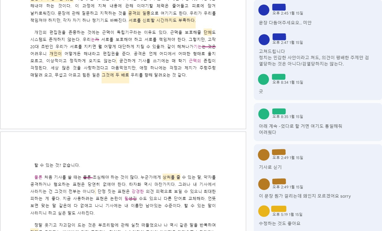 침묵 속에는 각기 다른 능력에 관한 힐난이 포함된다. 우리의 능력치가 전부 비슷한 수준인 건 아니다. 그러나 대개 모든 구성원이 동등하게 1-2개의 기사를 쓴다. 기사의 내용, 방향, 표현 등 한 기사를 통괄하는 독립된 편집권을 갖는다. 언뜻 보면 수평적이고 낭만적이나 실상 개인에게 모든 걸 떠맡기는 시스템이다. 자료 조사, 각주, 기사 방향을 각자 해결해야 한다. 누군가는 시야 확보가 어렵고, 누군가는 문장 전개 능력이 떨어진다. 서로 부족한 부분을 채워줘야 하지만, 자료 조사부터 기사 작성까지 협업할 자신도 없다. 그렇기에 이 모든 걸 편집권(을 빙자한 방치권)으로 무마한다.