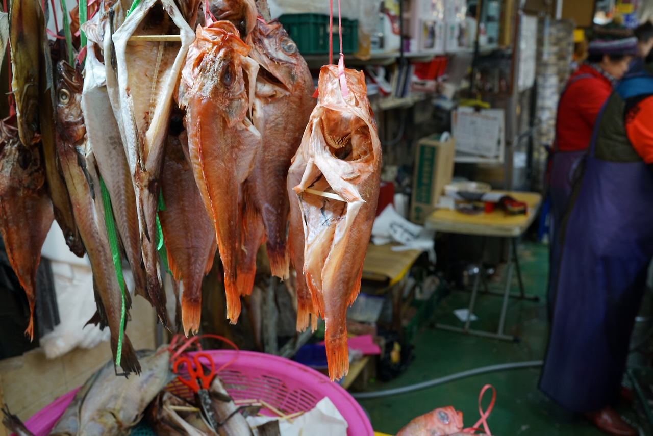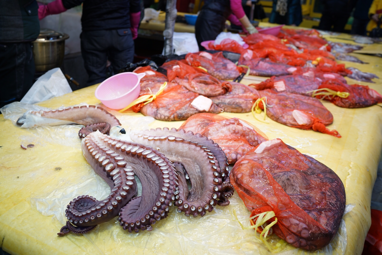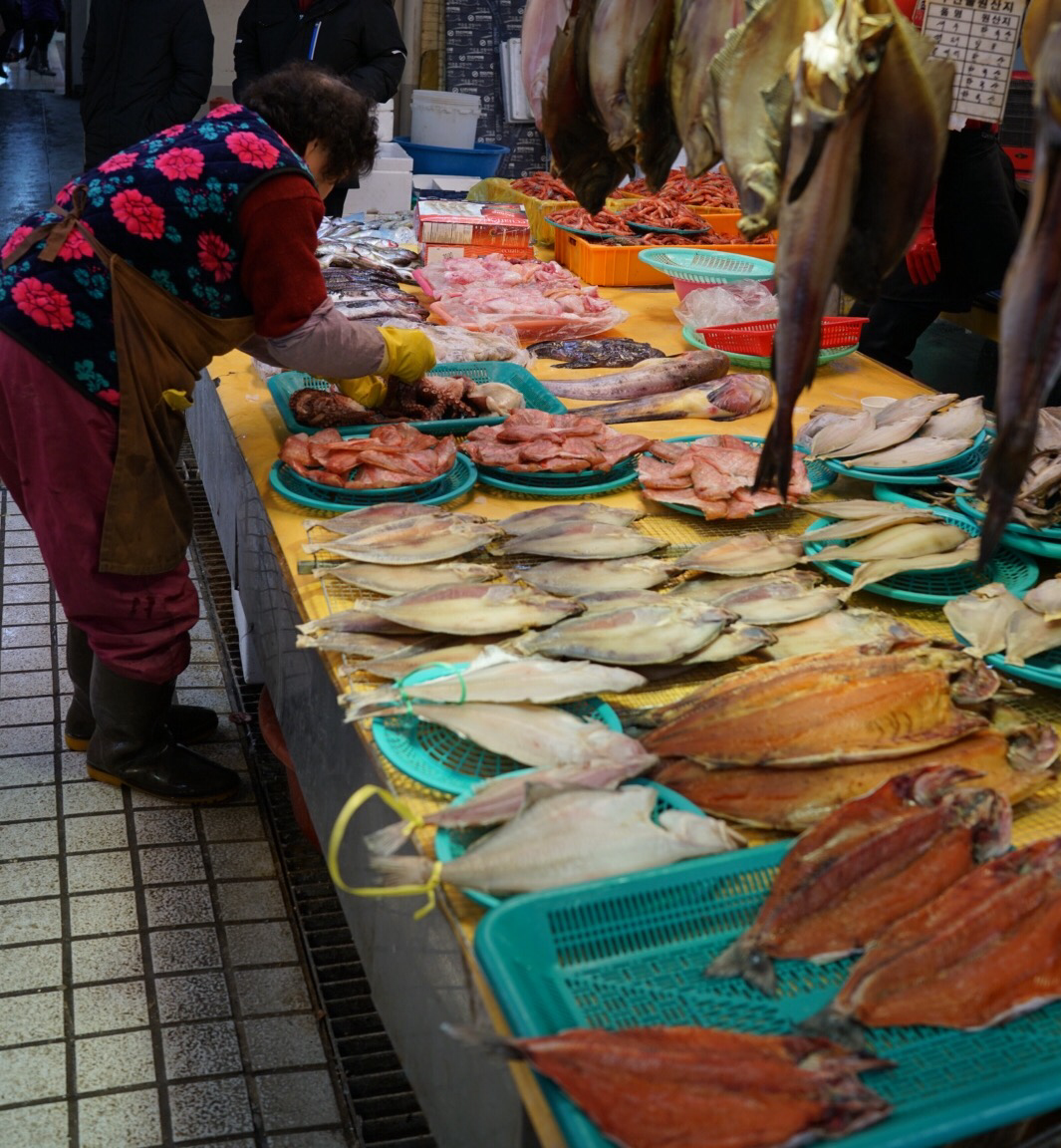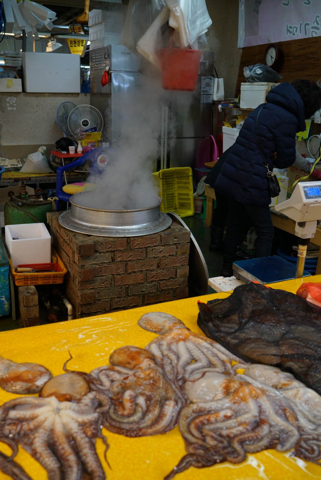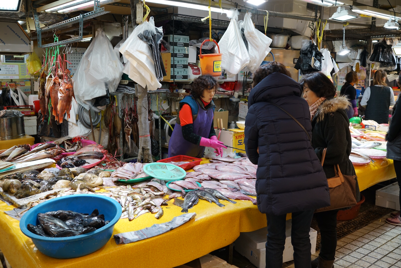 강릉 중앙시장 지하에는 어시장이 있다. 단골집에 들러 차례상에 올릴 문어를 골랐다. 설이 코앞이라 문어값이 금값이다. 문어가 데쳐지는 동안 세 가지 생선을 사러 다른 가게로 갔다. 우리집은 가자미, 열기 그리고 명태를 쪄서 상에 올린다. 아주머니가 생선을 손질하는 동안 나는 다른 집들을 기웃거리며 구경을 했다.