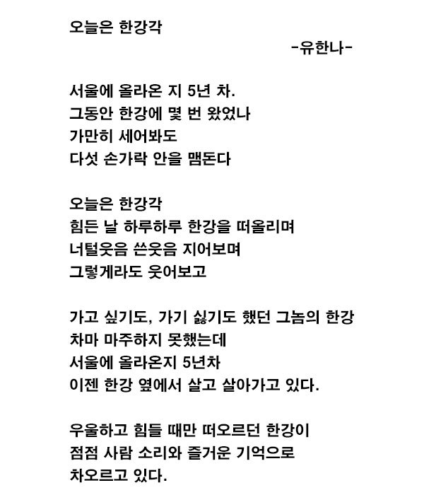 ‘나루백일장’ 지난 가을 뚝섬유원지에서 열린 <제9회 작당모의 프로젝트>.‘광진구’와 한강, 동네, 관계, 공간, 향, 따듯함이라는 6개의 카테고리를 주제로 서로가 느낀 광진구를 다양한 방식으로 풀어내는 시간을 가졌습니다.