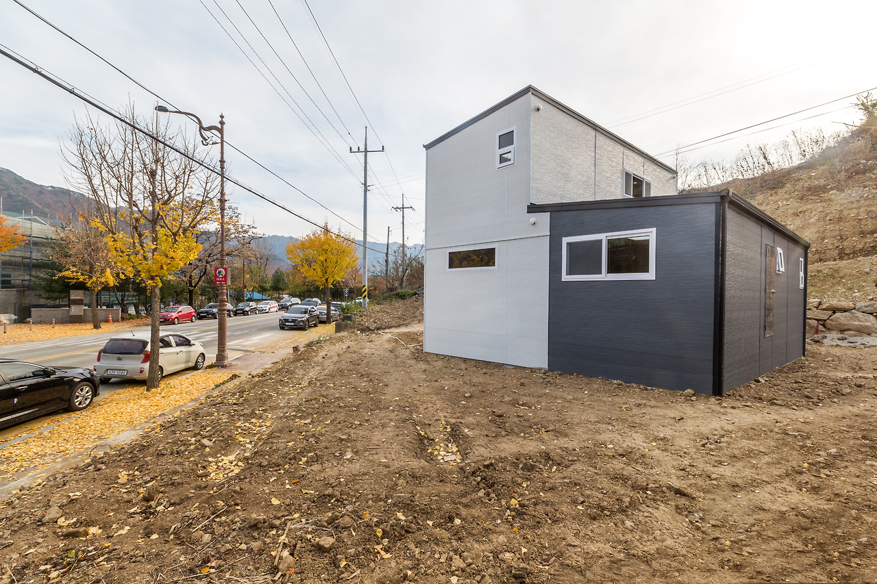 모듈의 조합을 다르게 할수록 전혀 다른 느낌을 자아내는 전원주택건축입니다. 주택의 한 면은 온전히 깨끗한 화이트톤으로 시공되어 깨끗하고 맑은 느낌을 주는 반면 다른 쪽은 차분한 그레이 색을 사용하여 주택을 입체적으로 표현하였습니다. 주택 옆으로는 차량 이동이 원활한 도로가 맞은편에 있어 교통의 편리함까지 얻을 수 있습니다. 더불어 아직 조경이 마무리되지 않았지만 현관과 마당의 거리가 있기 때문에 프라이빗 한 공간이 연출되어 프라이버시를 보호하였으며, 도로가 바로 보이는 주택의 방향에는 창을 작게 설계하여 삶을 보호할 수 있는 공간을 연출하였습니다.