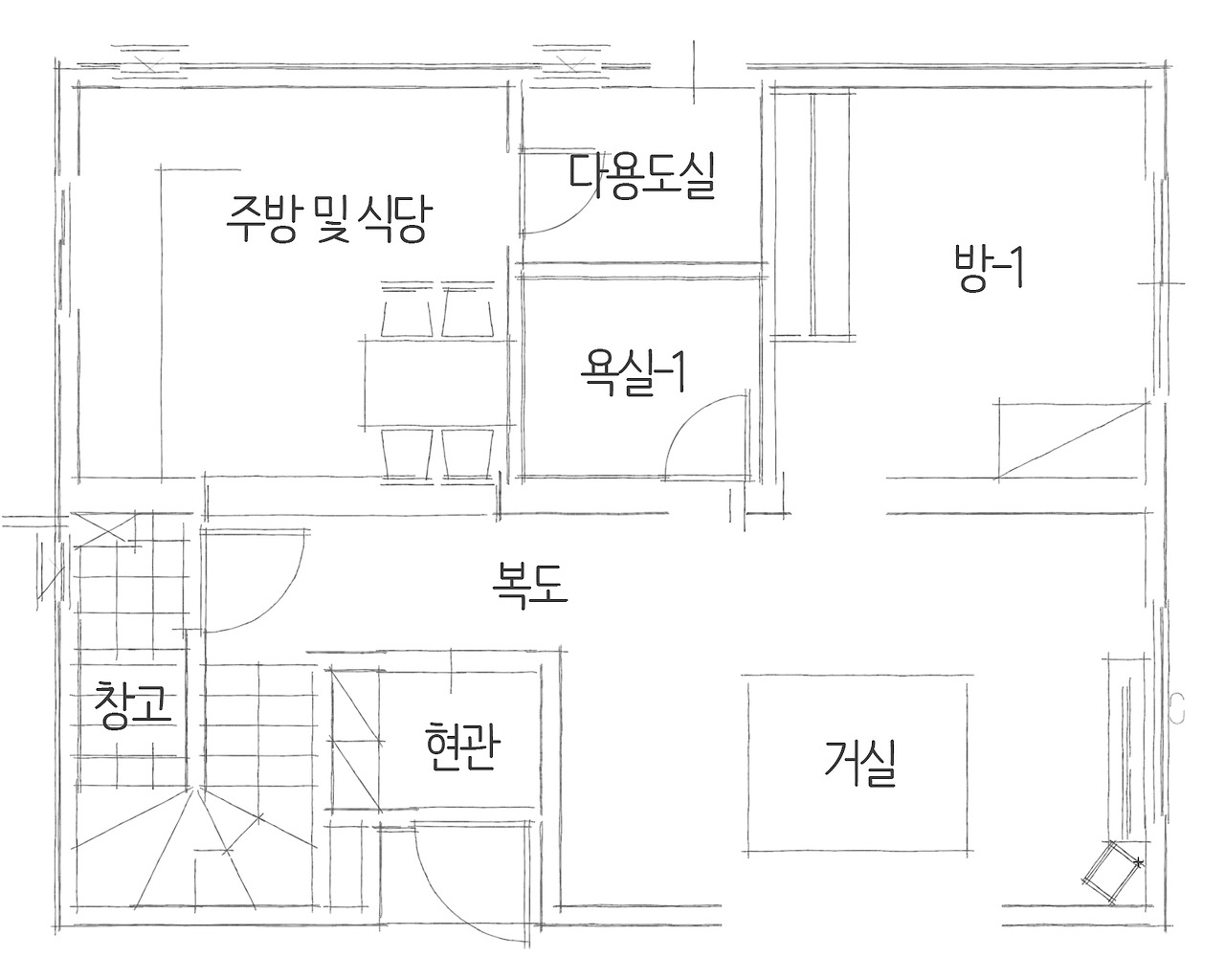 이번 전원주택건축 현장은 현관을 들어서면 복도가 있으며, 우측으로는 거실이 놓여있습니다. 주방과 다용도실을 일직선상에 배치하여 다용도실을 보조 주방 겸 수납공간으로 활용하여 공간의 활용도를 높였으며, 더불어 방과 욕실은 전원주택 건축 시 가까이에 두어 욕실에서 목욕 후 바로 침실로 와 충분한 휴식을 취할 수 있도록 설계하였습니다. 욕실은 주방과 방 사이에 있기 때문에 프라이빗 한 공간 속에서 씻을 수 있도록 시공하였습니다.