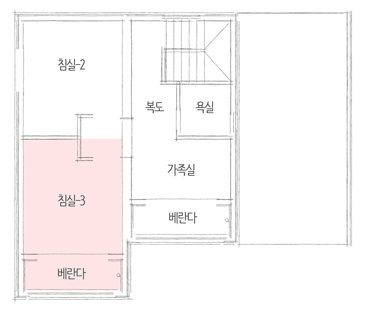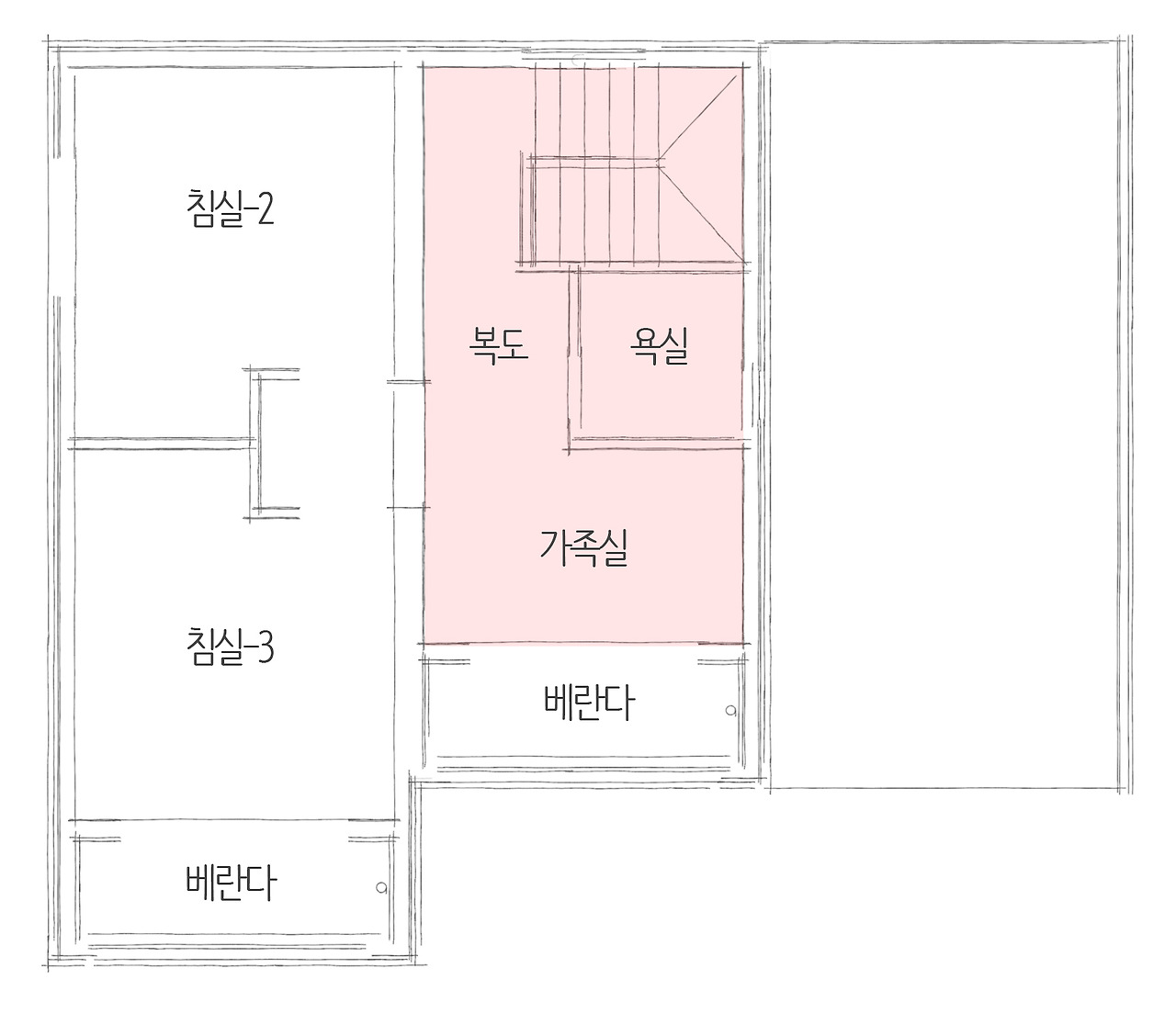 2층에는 복도와 함께 가족실이 이어집니다. 가족실에서는 붙박이장을 수납공간으로 활용하여 공간을 더 넓어 보이게 시공하였습니다. 더불어 각 복도의 벽지나 몰딩을 깔끔한 화이트톤으로 마무리하여 주택을 환하게 비추는 효과를 더 겸하였습니다.